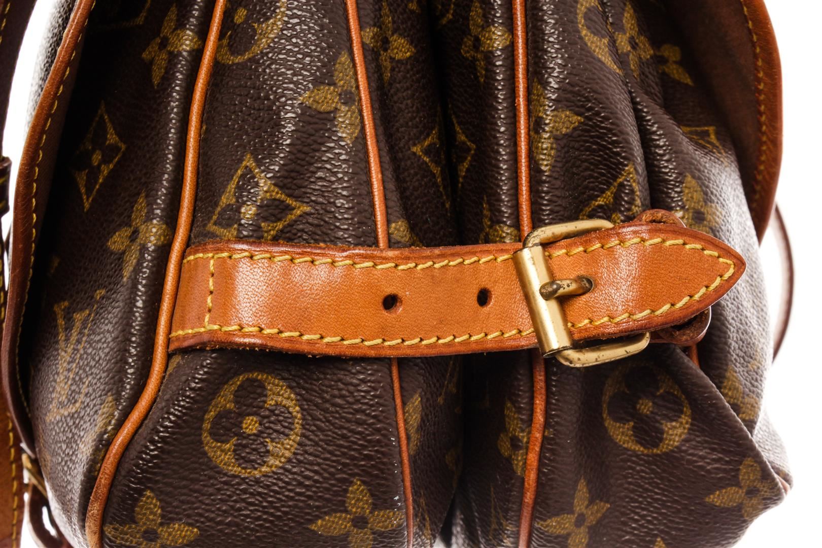 Louis Vuitton Brown Monogram Canvas Saumur 30 Messenger Bag. All available information is listed in the description and shown in the photos. Louis Vuitton Brown Monogram Canvas Saumur 30 Messenger Bag with features monogram canvas. interior compartments have large pockets for your accessories and laptop. dual front compartments in a saddle bag like style, with buckle closures. brass hardware and vachetta leather trim, opens up to two interior areas with slip pocket. lined in brown textile fabric, and holds together at the sides with adjustable buckles. adjustable long shoulder strap with shoulder guard. 10.5"L x 4"W x 8.5"H, Strap drop: 26" / 26.67 x 10.16 x 21.59 Cm