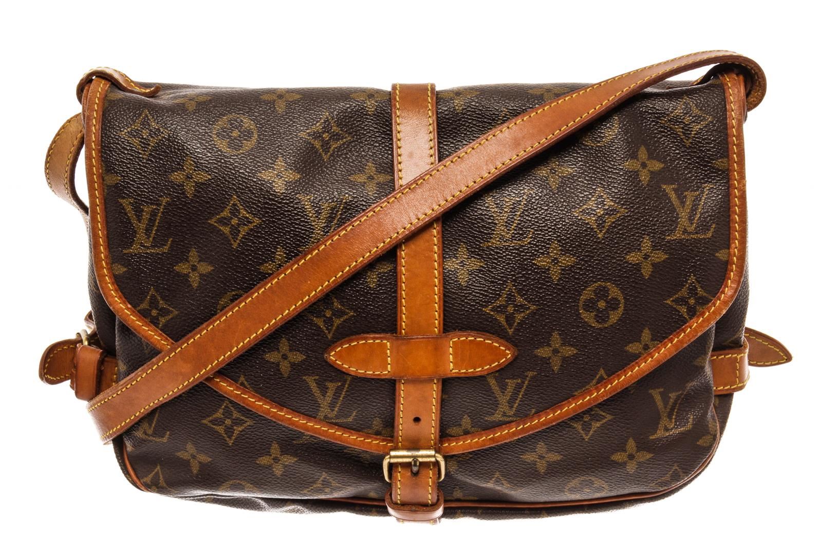Louis Vuitton Brown Monogram Canvas Saumur 30 Messenger Bag. All available information is listed in the description and shown in the photos. Louis Vuitton Brown Monogram Canvas Saumur 30 Messenger Bag with features monogram canvas. interior compartments have large pockets for your accessories and laptop. dual front compartments in a saddle bag like style, with buckle closures. brass hardware and vachetta leather trim, opens up to two interior areas with slip pocket. lined in brown textile fabric, and holds together at the sides with adjustable buckles. adjustable long shoulder strap with shoulder guard. 10.5"L x 4"W x 8.5"H, Strap drop: 26" / 26.67 x 10.16 x 21.59 Cm