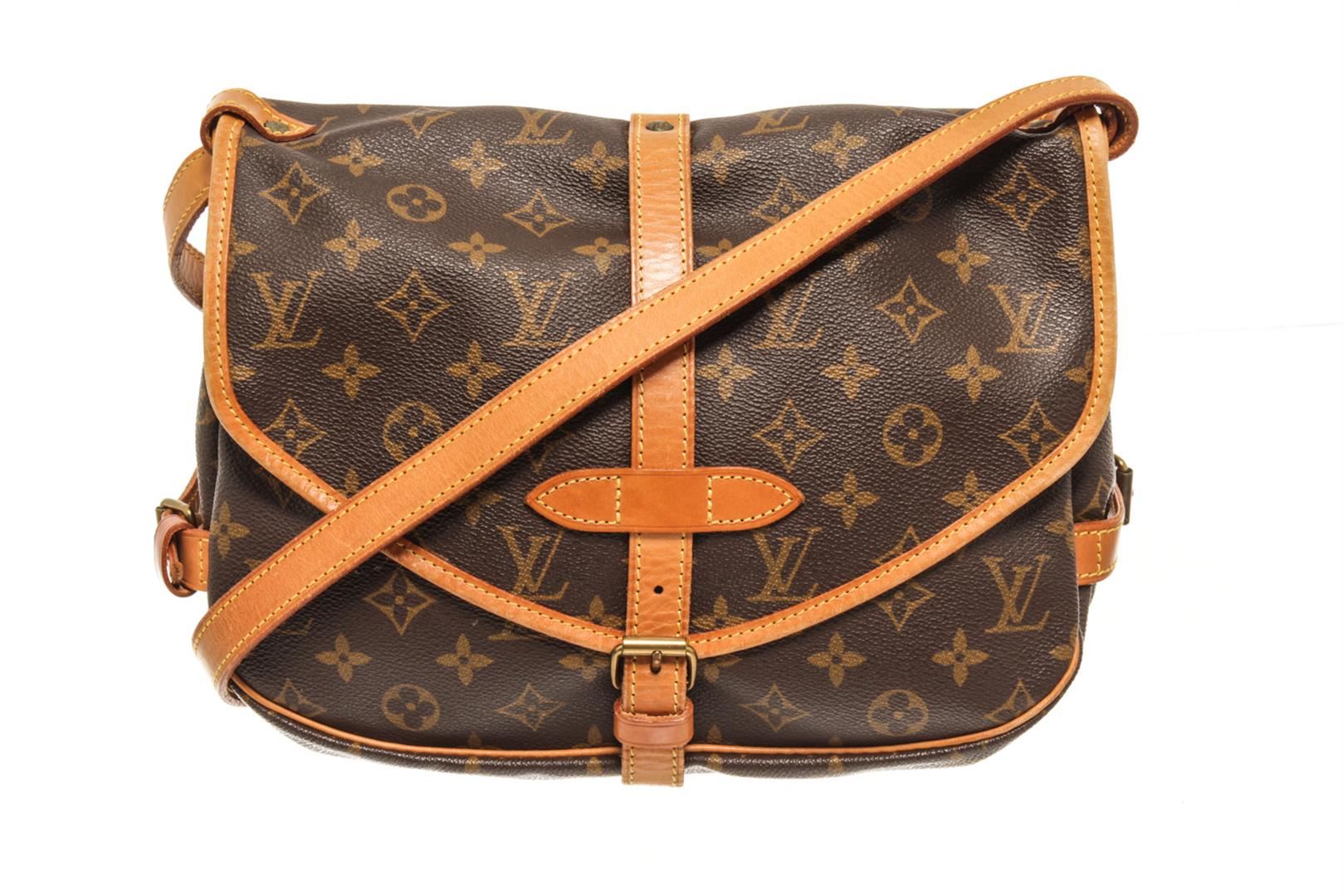 One Louis Vuitton Brown Monogram Canvas Saumur 30 Shoulder Bag. Item is sold AS-IS. All available information is listed in the description and shown in the photo. louis vuitton brown monogram canvas saumur 30 shoulder bag Height: 9 in (22.86 cm), Width: 11.5 in (29.21 cm), Depth: 4.5 in (11.43 cm)