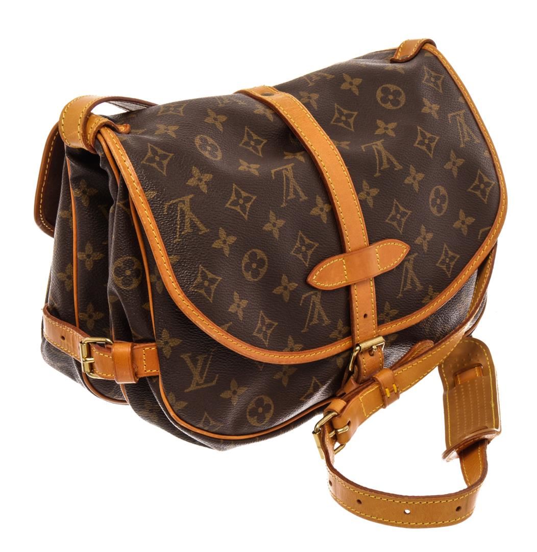 Louis Vuitton Brown Monogram Canvas Saumur 30 Shoulder Bag. All available information is listed in the description and shown in the photos. Louis Vuitton Brown Monogram Canvas Saumur 30 Shoulder Bag with brown, printed, brass hardware, single adjustable shoulder strap, single exterior pocket, canvas lining & single interior pocket, buckle closure at front. Height: 9 in (22.86 cm), Width: 11.5 in (29.21 cm), Depth: 4.5 in (11.43 cm)