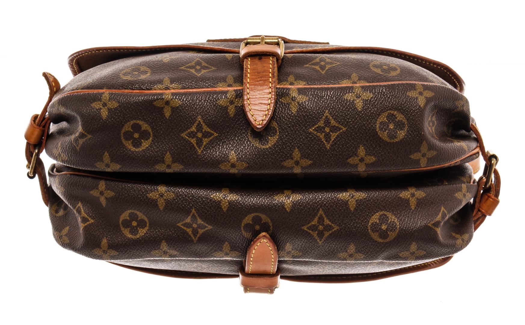 Louis Vuitton Brown Monogram Canvas Saumur 30cm Shoulder Bag. All available information is listed in the description and shown in the photos. Louis Vuitton Brown Monogram Canvas Saumur 30cm Shoulder Bag with brown coated canvas, brass hardware, leather trim, single adjustable shoulder strap, leather trim embellishment, canvas lining & three interior pockets, flap & buckle closures at front. Height: 10" Width: 12" Depth: 9.25", Shoulder Strap Drop: 19.5" / 25.4 x 30.48 x 23.49 Cm