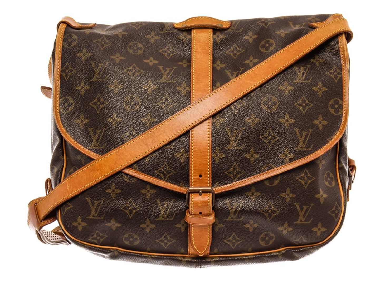 Louis Vuitton Brown Monogram Canvas Saumur 35 Messenger Bag. All available information is listed in the description and shown in the photos. Louis Vuitton Brown Monogram Canvas Saumur 35 Messenger Bag with brown coated canvas, brass hardware, single adjustable shoulder strap, leather trim embellishment, canvas lining & three interior pockets, buckle closure at front. Height: 12" Width: 14" Depth: 4.25", Shoulder Strap Drop: 17.75" / 30.48 x 35.56 x 10.79 Cm