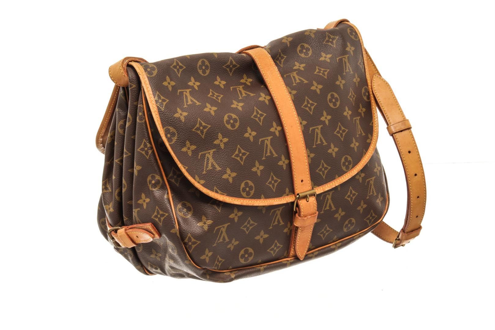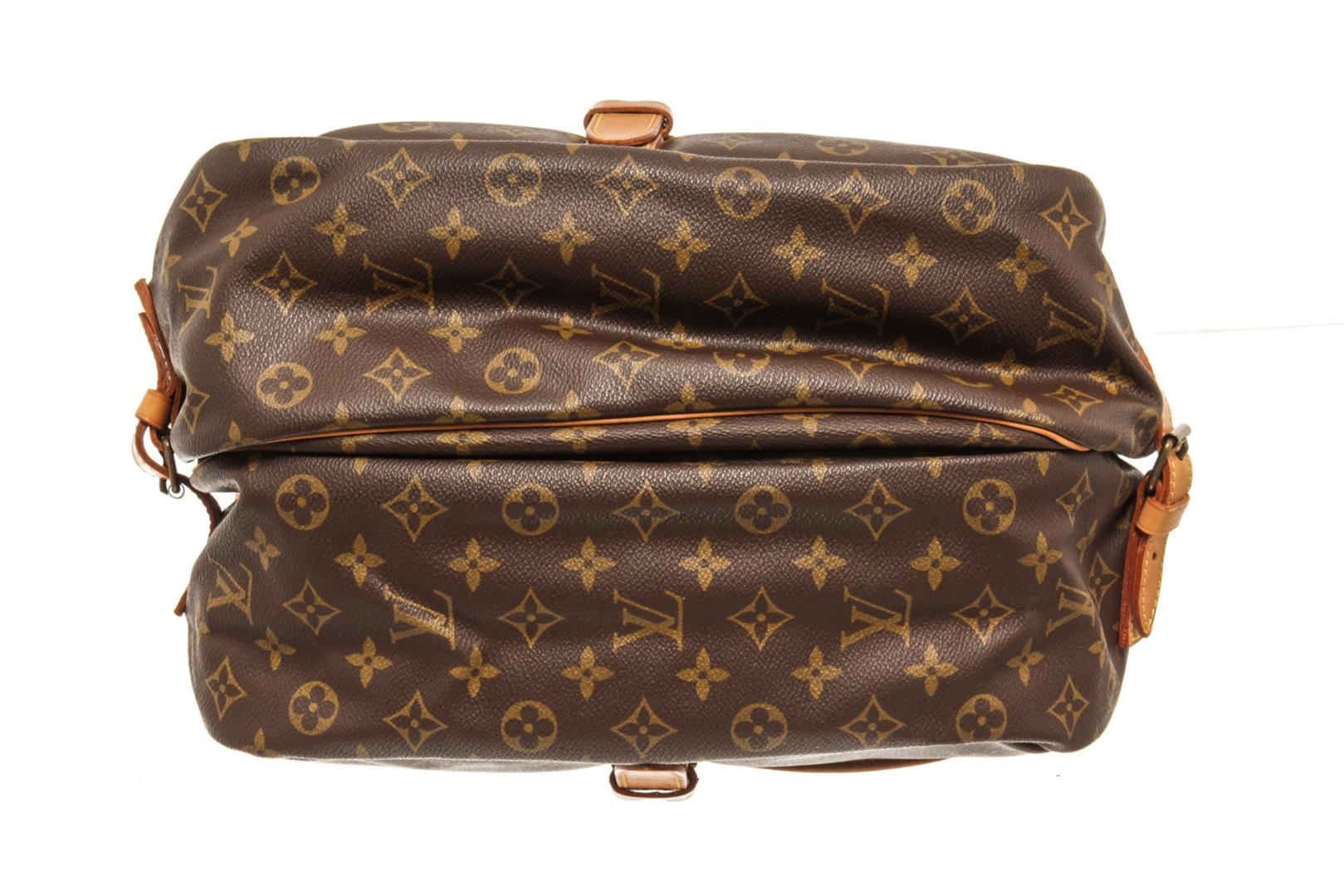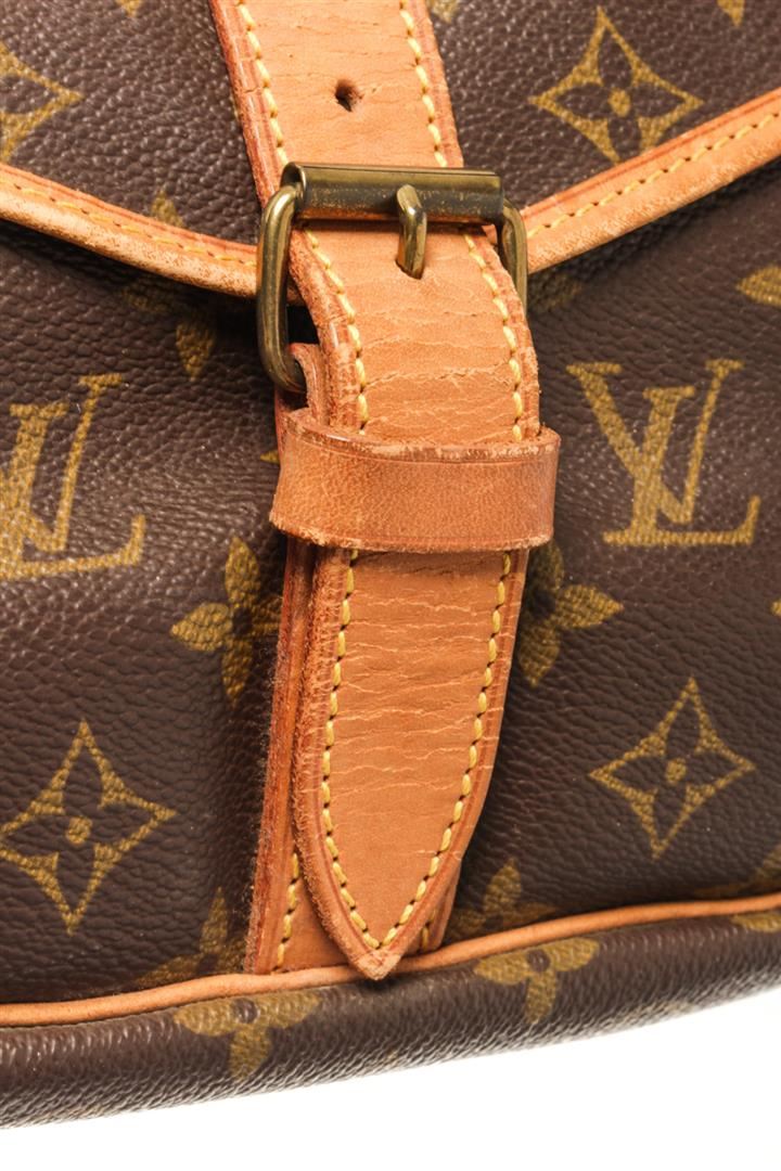 One Louis Vuitton Brown Monogram Canvas Saumur 35 Shoulder Bag. Item is sold AS-IS. All available information is listed in the description and shown in the photo. louis vuitton brown monogram canvas saumur 35 shoulder bag with adjustable shoulder strap, a main internal compartment, an internal slip pocket, a front logo patch, a monogram pattern, side buckle fastenings, strap closures with a buckle fastenings Width 13.4 in, Height 12.2 in, Depth 9.4 in, Strap 20.1 in / Width 34 cm, Height 31 cm, Depth 24 cm, Strap 51 cm