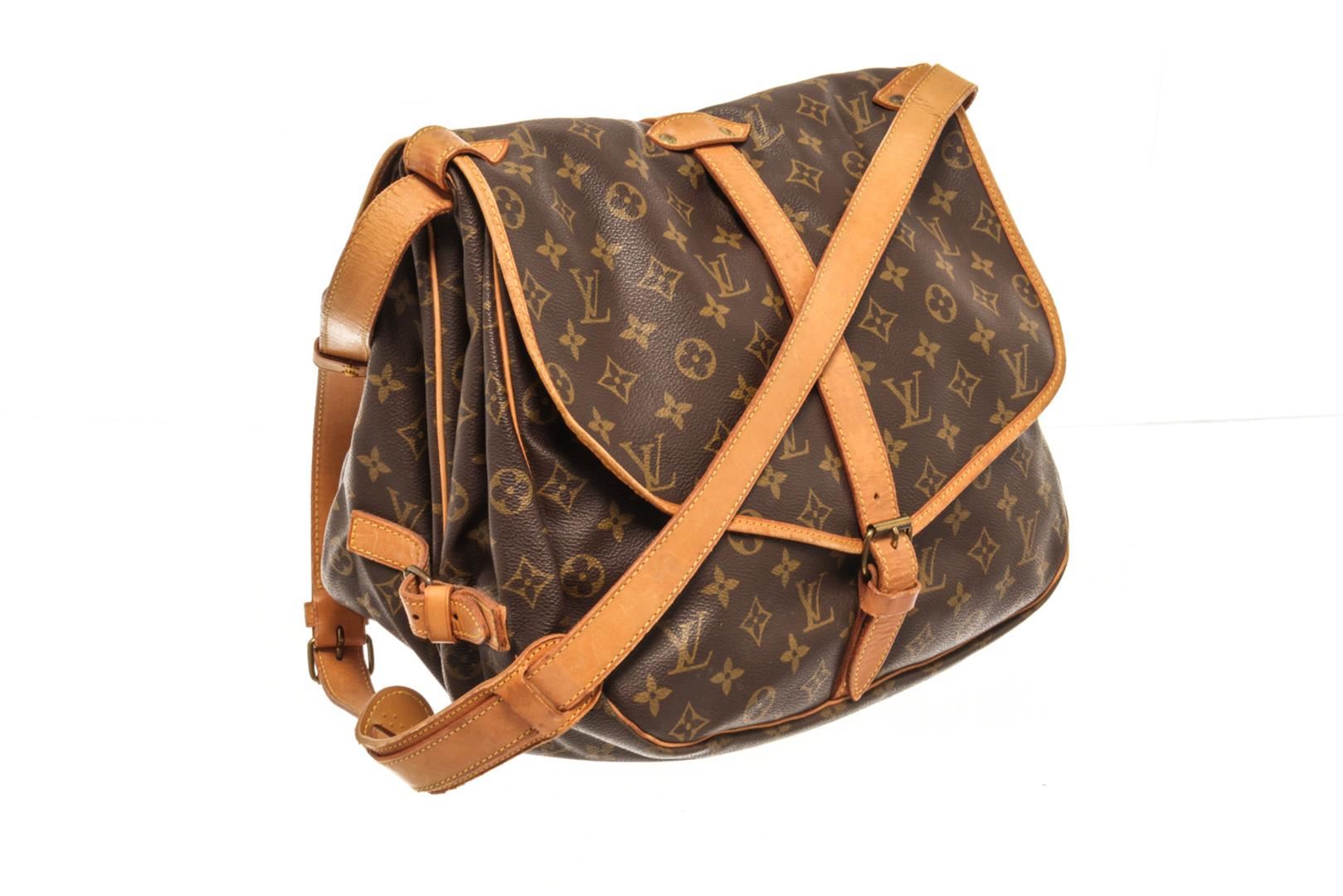 One Louis Vuitton Brown Monogram Canvas Saumur 35 Shoulder Bag. Item is sold AS-IS. All available information is listed in the description and shown in the photo. louis vuitton brown monogram canvas saumur 35 shoulder bag with adjustable shoulder strap, a main internal compartment, an internal slip pocket, a front logo patch, a monogram pattern, side buckle fastenings, strap closures with a buckle fastenings Width 13.4 in, Height 12.2 in, Depth 9.4 in, Strap 20.1 in / Width 34 cm, Height 31 cm, Depth 24 cm, Strap 51 cm