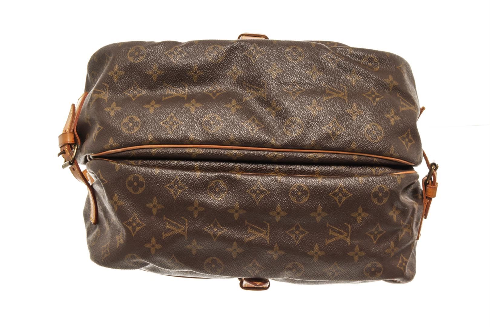 One Louis Vuitton Brown Monogram Canvas Saumur 35 Shoulder Bag. Item is sold AS-IS. All available information is listed in the description and shown in the photo. louis vuitton brown monogram canvas saumur 35 shoulder bag with adjustable shoulder strap, a main internal compartment, an internal slip pocket, a front logo patch, a monogram pattern, side buckle fastenings, strap closures with a buckle fastenings Width 13.4 in, Height 12.2 in, Depth 9.4 in, Strap 20.1 in / Width 34 cm, Height 31 cm, Depth 24 cm, Strap 51 cm