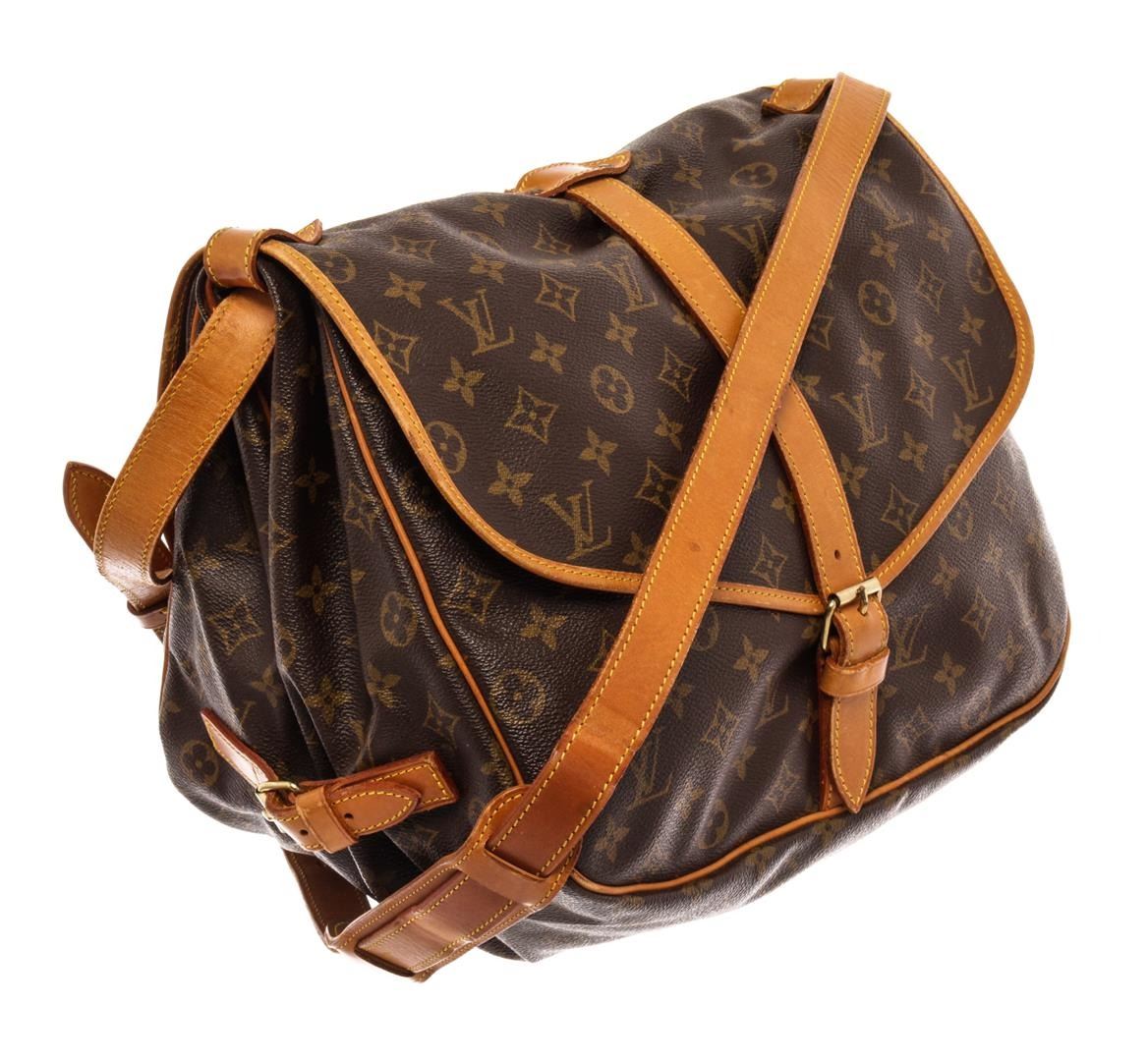 Louis Vuitton Brown Monogram Canvas Saumur 35cm Messenger Bag. All available information is listed in the description and shown in the photos. Louis Vuitton Brown Monogram Canvas Saumur 35cm Messenger Bag with brass hardware, leather trim, single adjustable shoulder strap, leather trim embellishment, canvas lining & three interior pockets, buckle closures at front & back. Height: 13" Width: 12.75" Depth: 3.25", Shoulder Strap Drop: 17.75" / 33.02 x 32.38 x 8.25 Cm