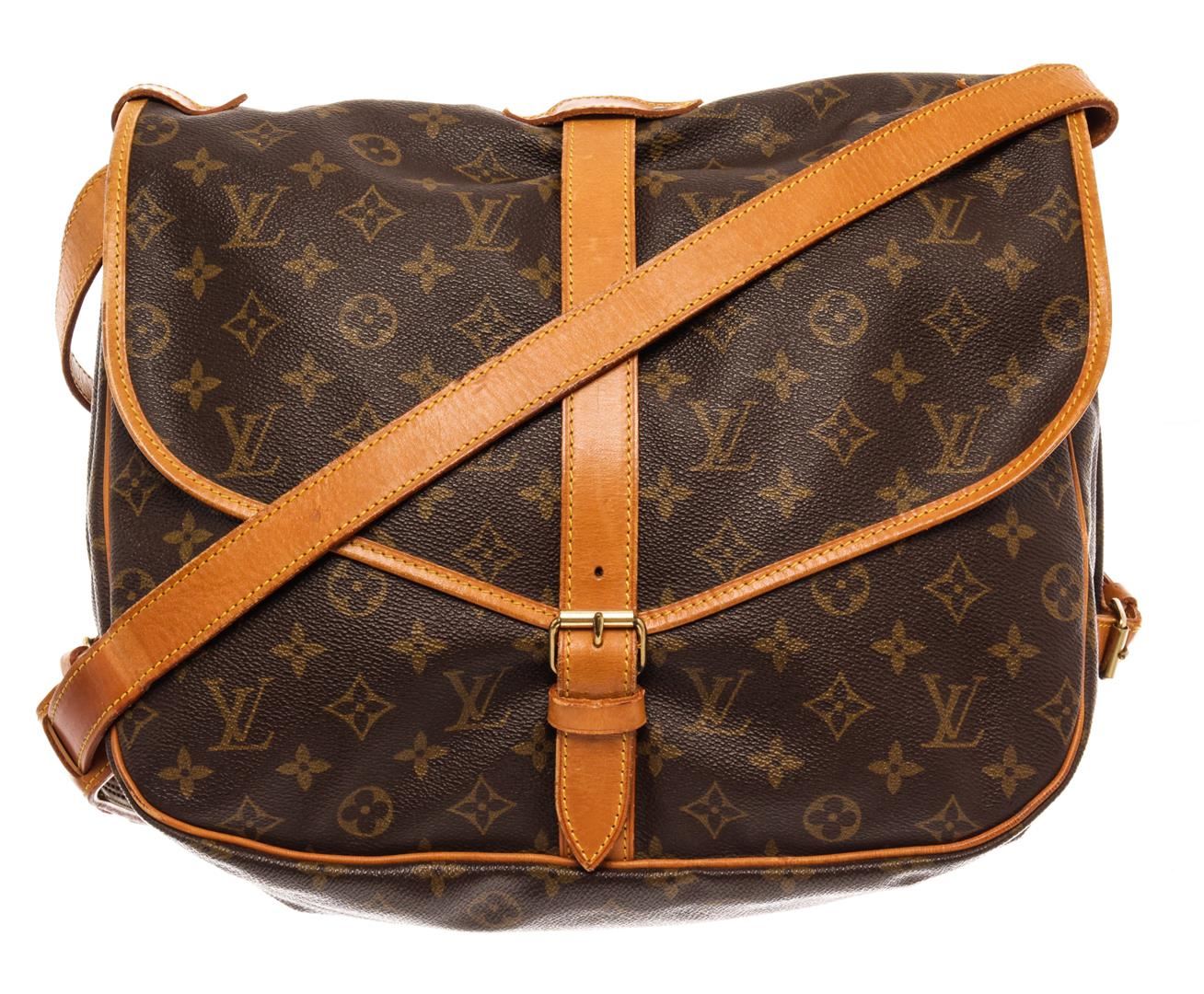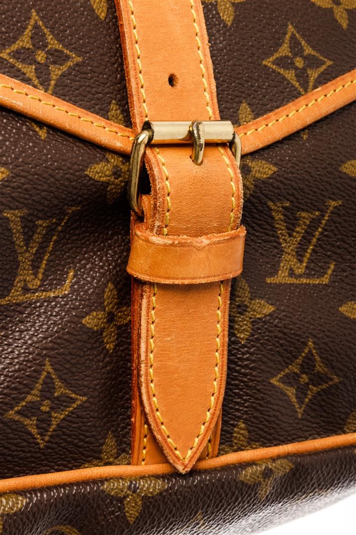 Louis Vuitton Brown Monogram Canvas Saumur 35cm Messenger Bag. All available information is listed in the description and shown in the photos. Louis Vuitton Brown Monogram Canvas Saumur 35cm Messenger Bag with brass hardware, leather trim, single adjustable shoulder strap, leather trim embellishment, canvas lining & three interior pockets, buckle closures at front & back. Height: 13" Width: 12.75" Depth: 3.25", Shoulder Strap Drop: 17.75" / 33.02 x 32.38 x 8.25 Cm
