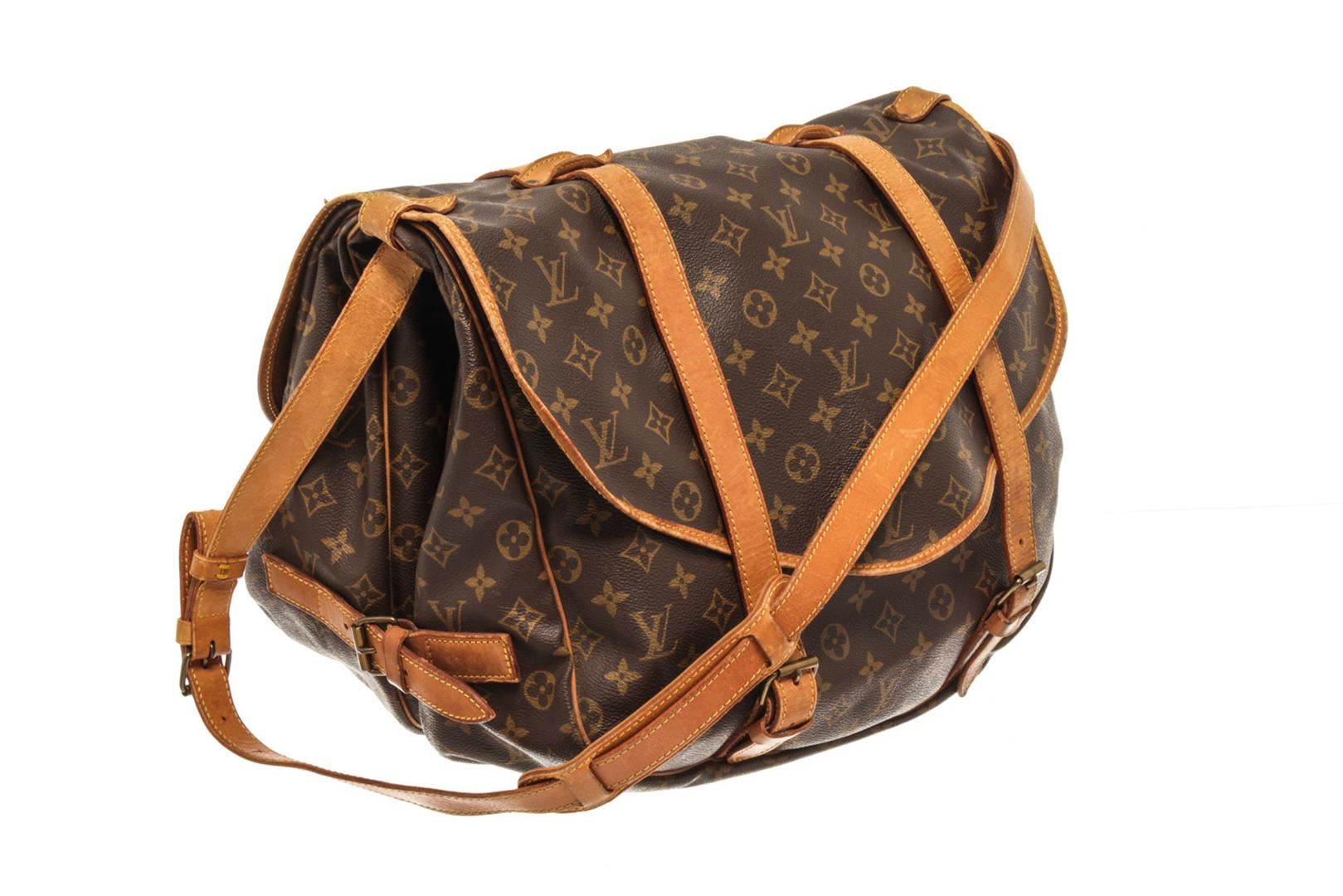 One Louis Vuitton Brown Monogram Canvas Saumur 43 Shoulder Bag. Item is sold AS-IS. All available information is listed in the description and shown in the photo. Louis Vuitton Brown Monogram Canvas Saumur 43 Shoulder Bag with gold-tone hardware, canvas/leather, double-strap design buckle fastening, side buckle fastening, adjustable shoulder strap internal patch pocket full lining. Depth 9.4 in, Height 12.2 in, Strap 20.1 in, Width 16.5 in / Depth 24 cm, Height 31 cm, Strap 51 cm, Width 42 cm