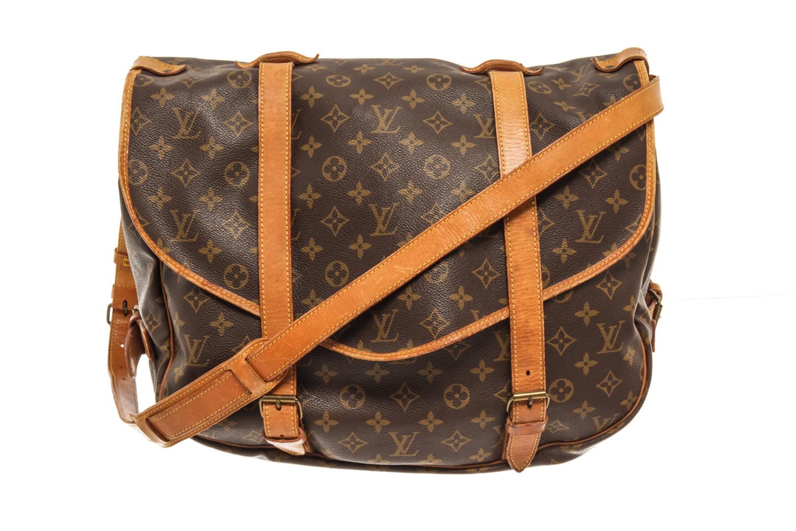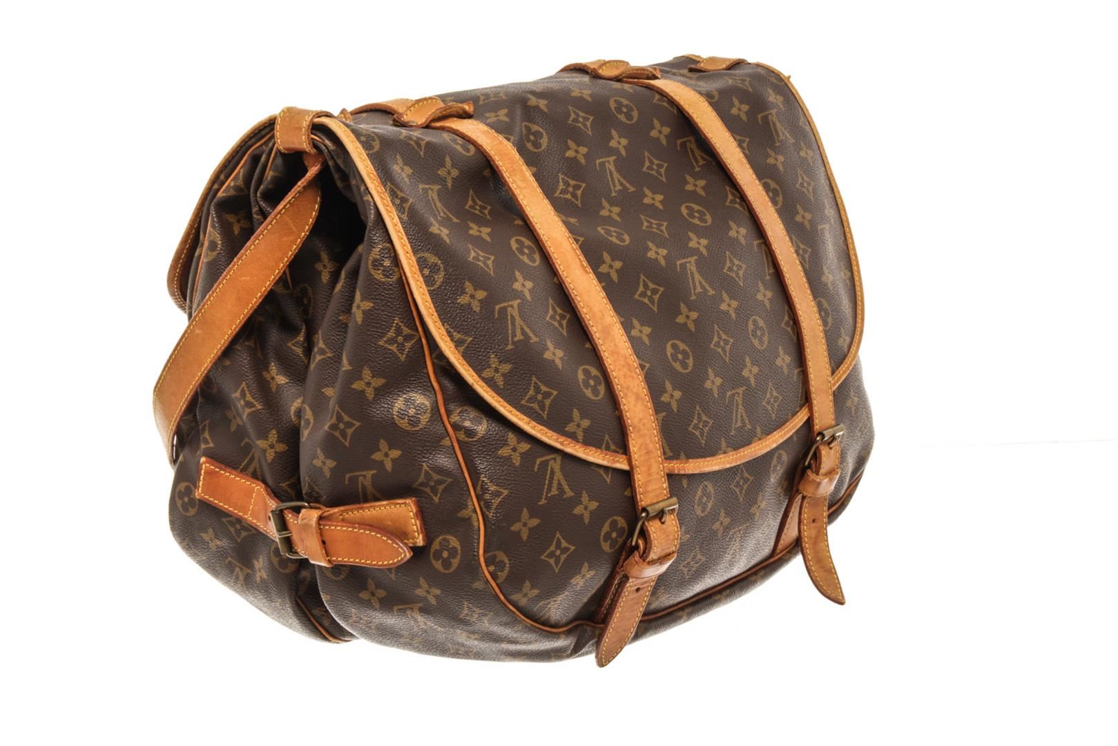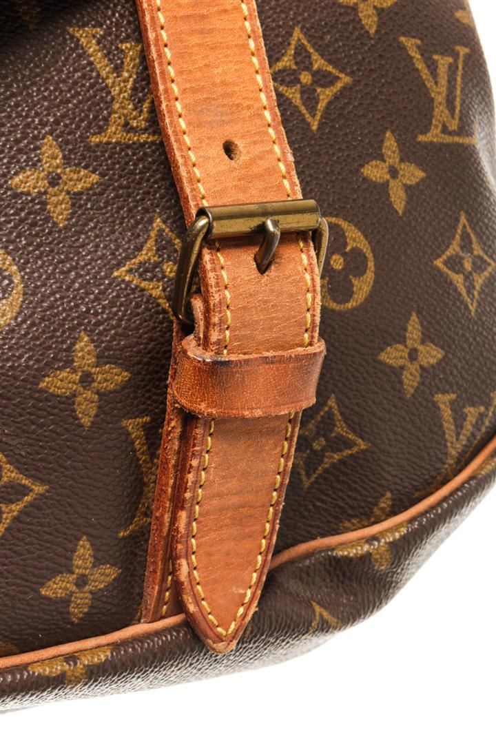 One Louis Vuitton Brown Monogram Canvas Saumur 43 Shoulder Bag. Item is sold AS-IS. All available information is listed in the description and shown in the photo. Louis Vuitton Brown Monogram Canvas Saumur 43 Shoulder Bag with gold-tone hardware, canvas/leather, double-strap design buckle fastening, side buckle fastening, adjustable shoulder strap internal patch pocket full lining. Depth 9.4 in, Height 12.2 in, Strap 20.1 in, Width 16.5 in / Depth 24 cm, Height 31 cm, Strap 51 cm, Width 42 cm