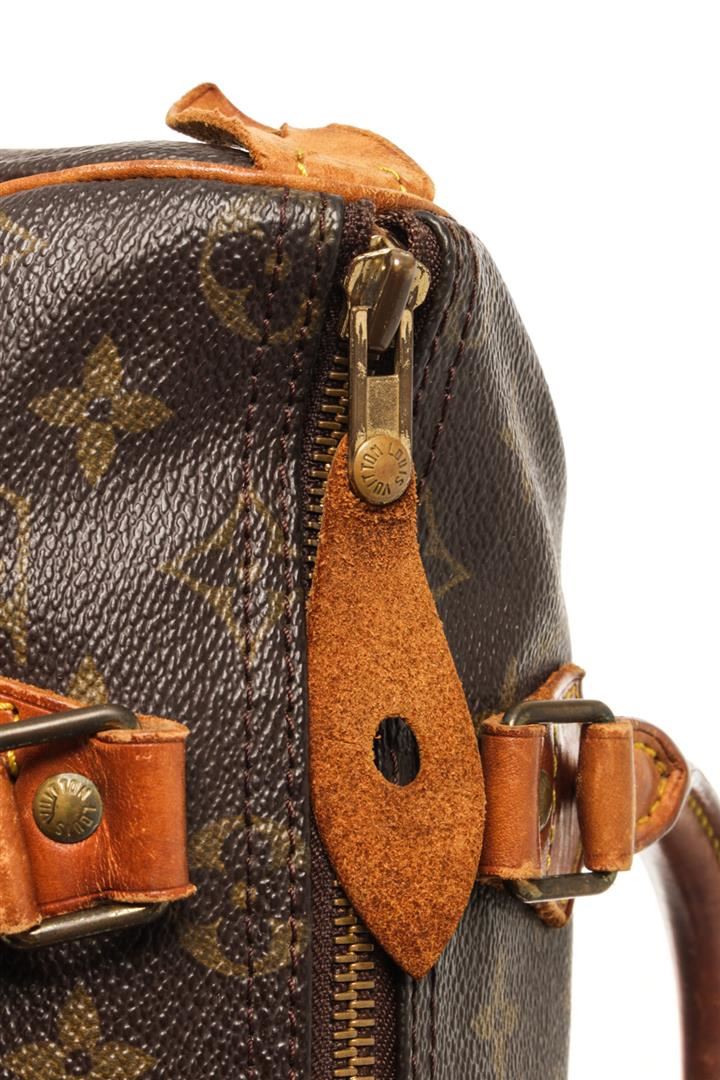 One Louis Vuitton Brown Monogram Canvas Speedy 25 Cm Handbag. Item is sold AS-IS. All available information is listed in the description and shown in the photo. Louis Vuitton Brown Monogram Canvas Speedy 25 Cm Handbag with monogram coated canvas exterior, vanchetta leather top handle, brown fabric lining, one interior slip pocket, top zip closure, and gold-tone hardware.
