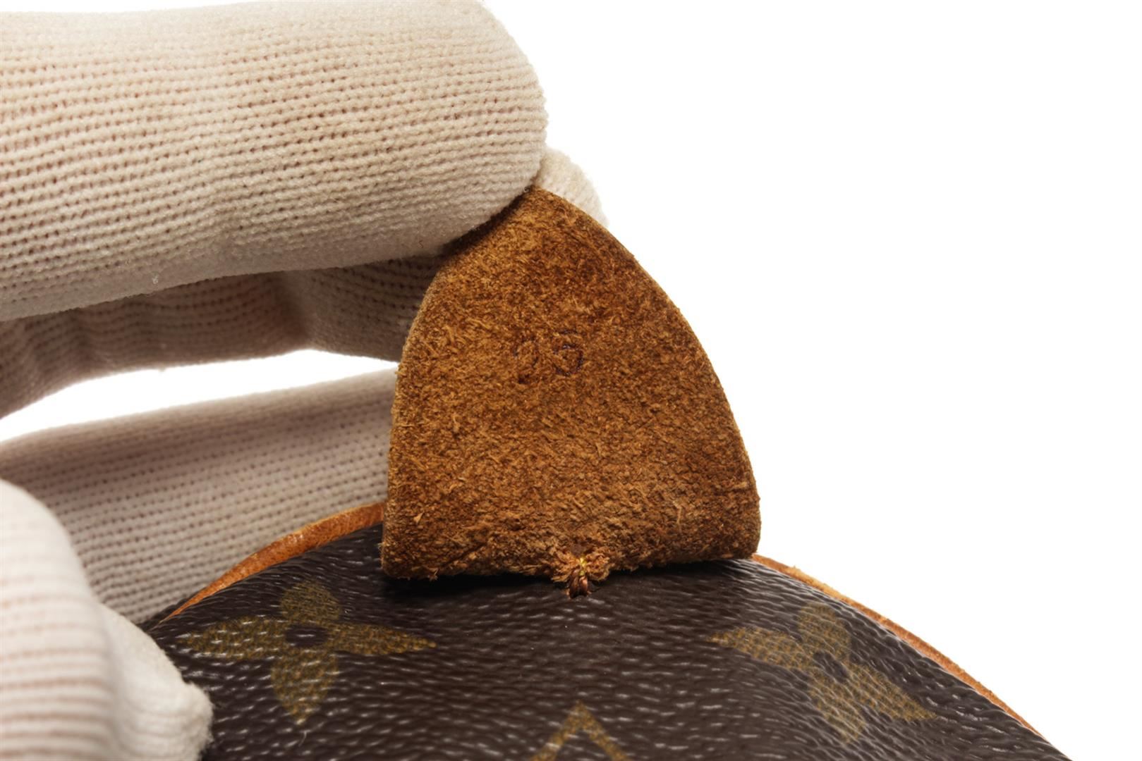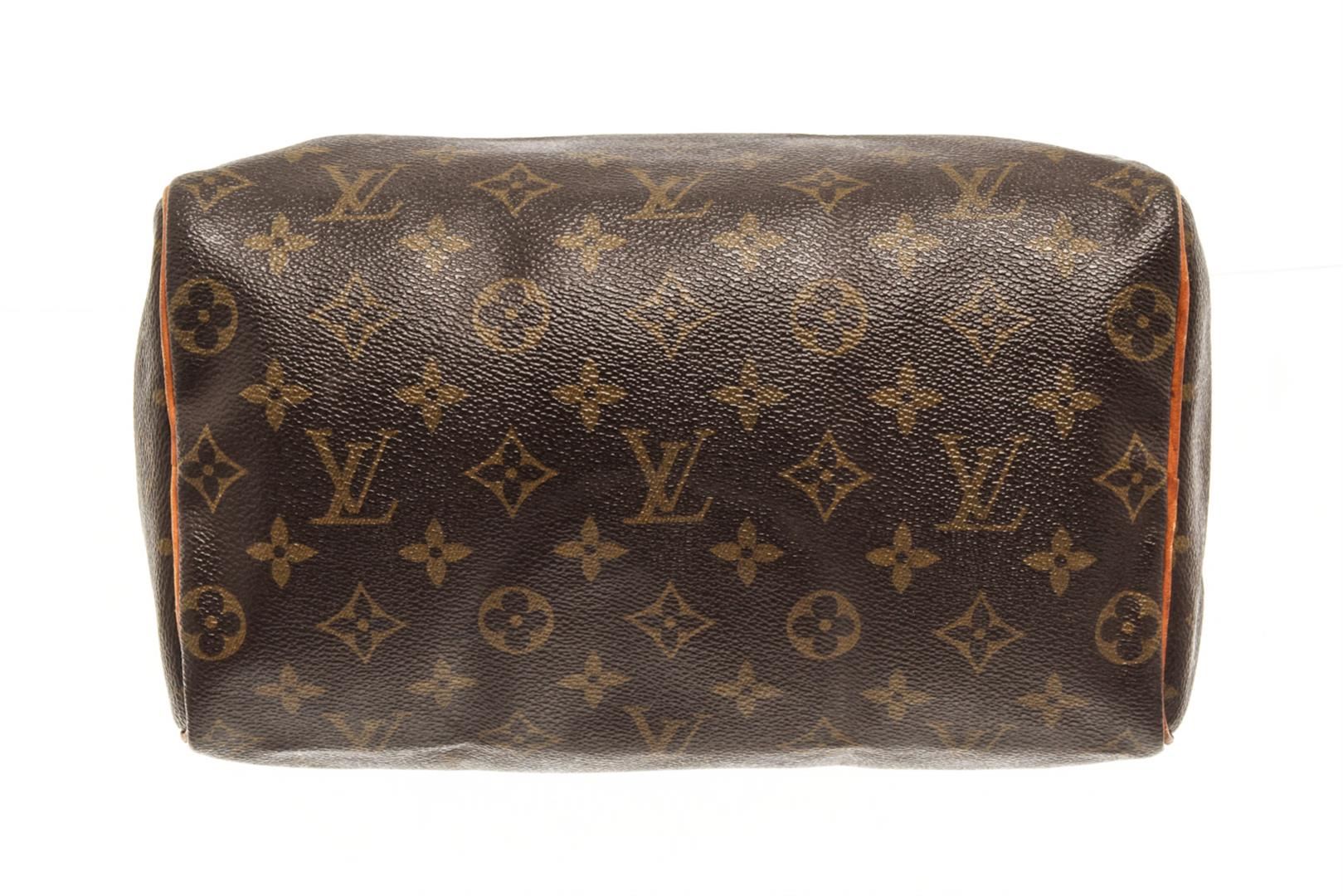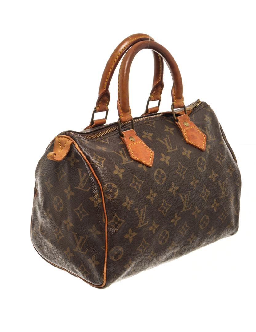 One Louis Vuitton Brown Monogram Canvas Speedy 25 Cm Handbag. Item is sold AS-IS. All available information is listed in the description and shown in the photo. Louis Vuitton Brown Monogram Canvas Speedy 25 Cm Handbag with monogram coated canvas exterior, vanchetta leather top handle, brown fabric lining, one interior slip pocket, top zip closure, and gold-tone hardware.