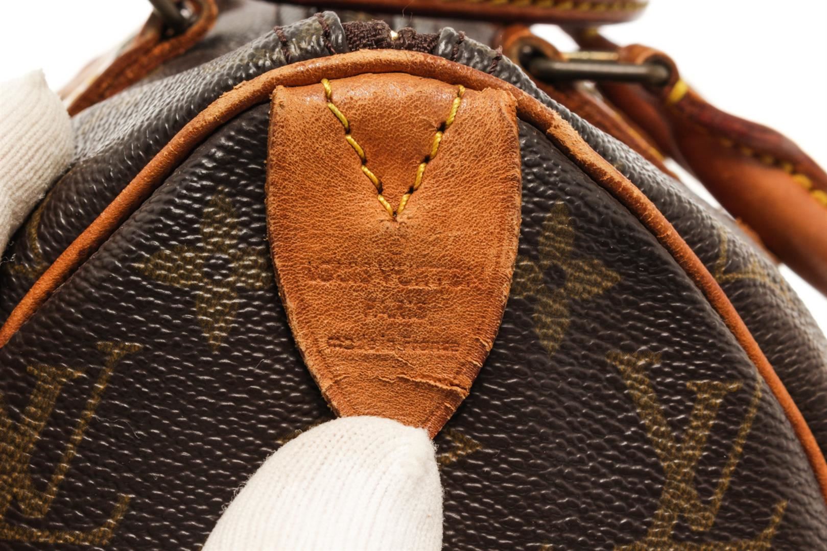 One Louis Vuitton Brown Monogram Canvas Speedy 25 Cm Handbag. Item is sold AS-IS. All available information is listed in the description and shown in the photo. Louis Vuitton Brown Monogram Canvas Speedy 25 Cm Handbag with monogram coated canvas exterior, vanchetta leather top handle, brown fabric lining, one interior slip pocket, top zip closure, and gold-tone hardware.