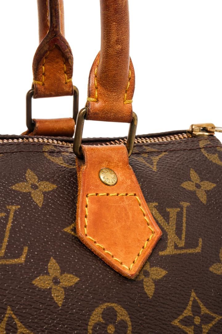 Louis Vuitton Brown Monogram Canvas Speedy 25 Satchel Bag. All available information is listed in the description and shown in the photos. Louis Vuitton Brown Monogram Canvas Speedy 25 Satchel Bag with brass hardware, leather trim, rolled handles, canvas lining & single interior pocket, zip closure at top. Height: 7.25" Width: 10" Depth: 5.5", Handle Drop: 3" / 18.41 x 25.4 x 13.97 Cm