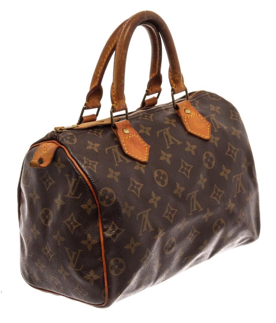 Louis Vuitton Brown Monogram Canvas Speedy 25 Satchel Bag. All available information is listed in the description and shown in the photos. Louis Vuitton Brown Monogram Canvas Speedy 25 Satchel Bag with brass hardware, leather trim, rolled handles, canvas lining & single interior pocket, zip closure at top. Height: 7.25" Width: 10" Depth: 5.5", Handle Drop: 3" / 18.41 x 25.4 x 13.97 Cm