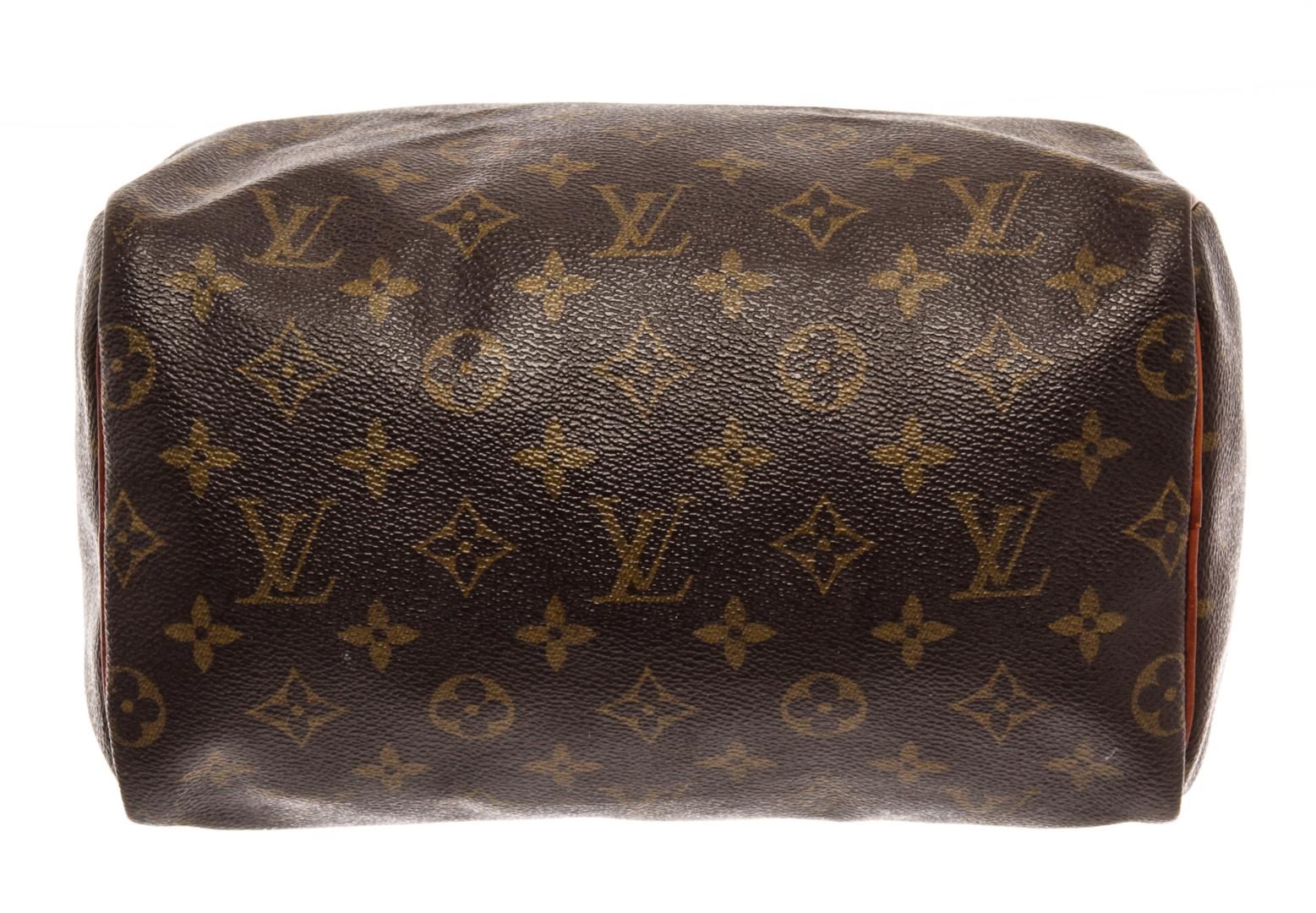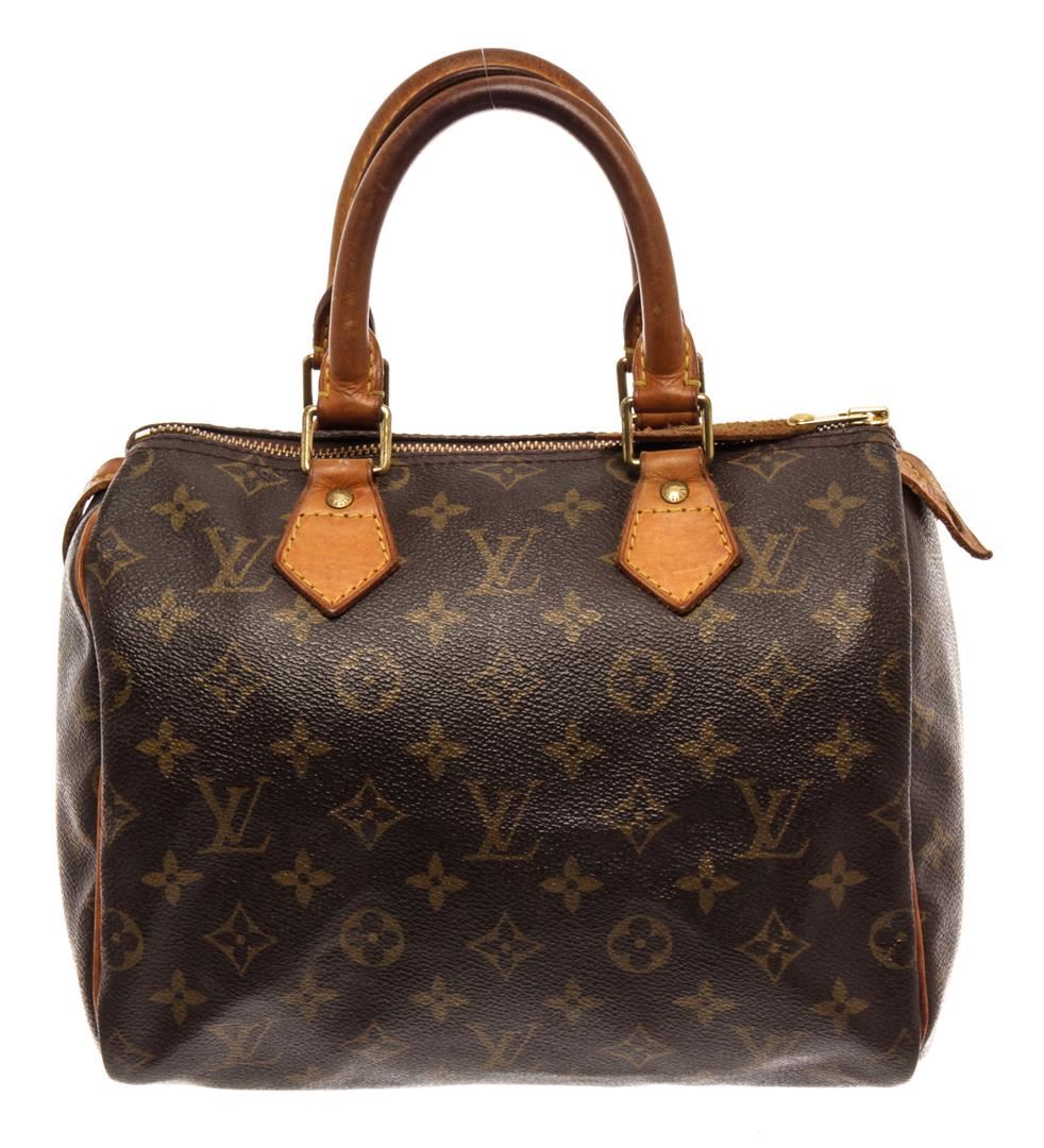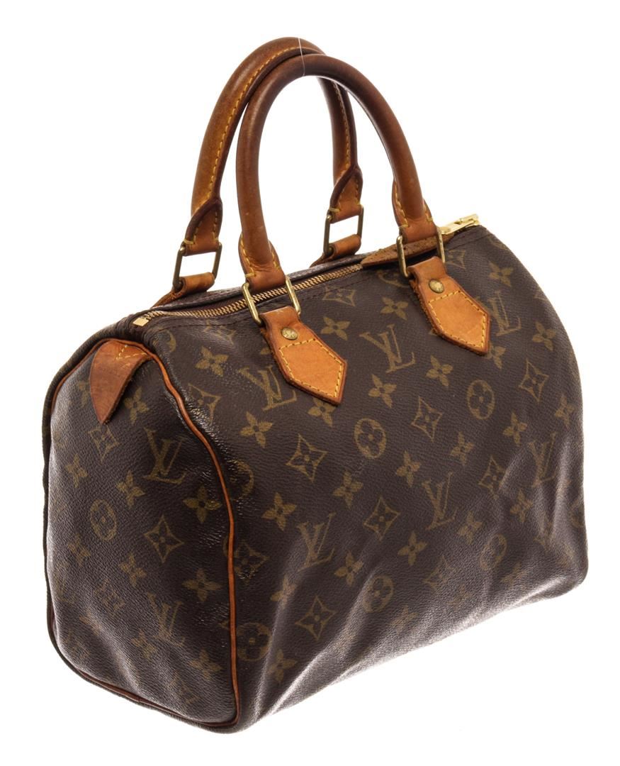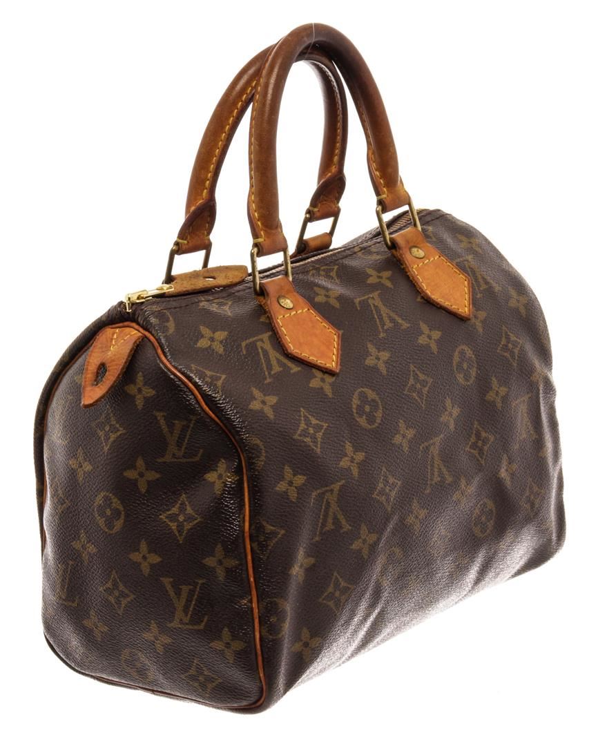 Louis Vuitton Brown Monogram Canvas Speedy 25 Satchel Bag. All available information is listed in the description and shown in the photos. Louis Vuitton Brown Monogram Canvas Speedy 25 Satchel Bag with brass hardware, leather trim, rolled handles, canvas lining & single interior pocket, zip closure at top. Height: 7.25" Width: 10" Depth: 5.5", Handle Drop: 3" / 18.41 x 25.4 x 13.97 Cm