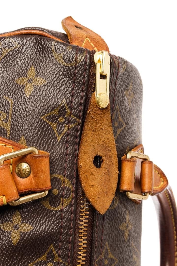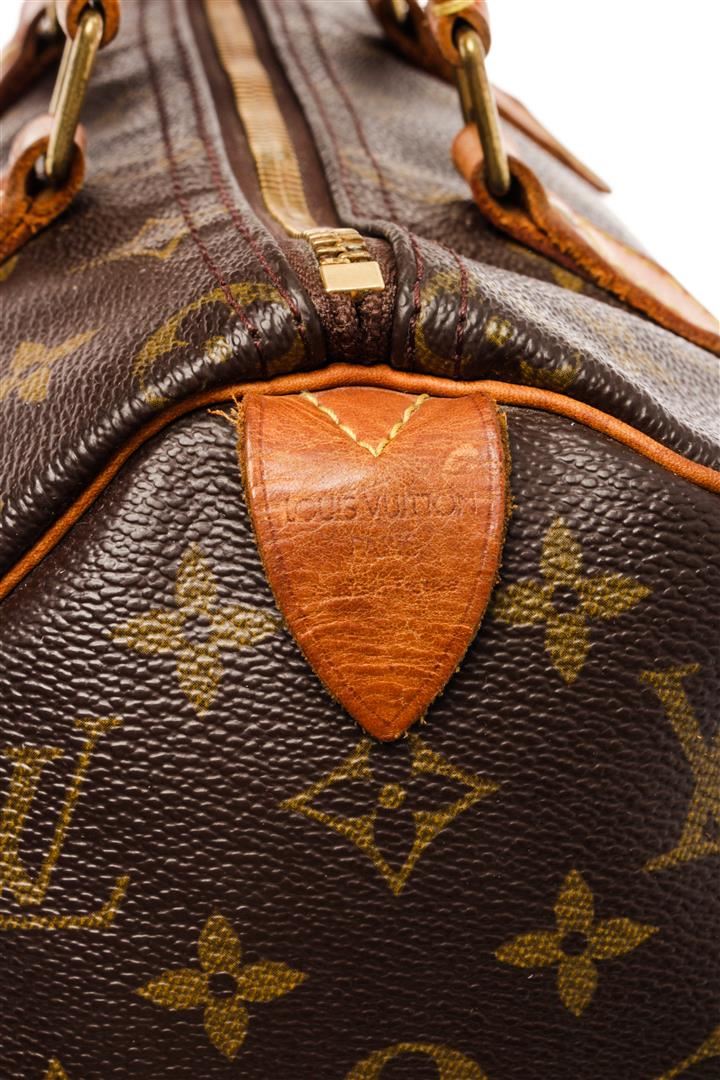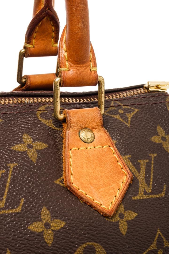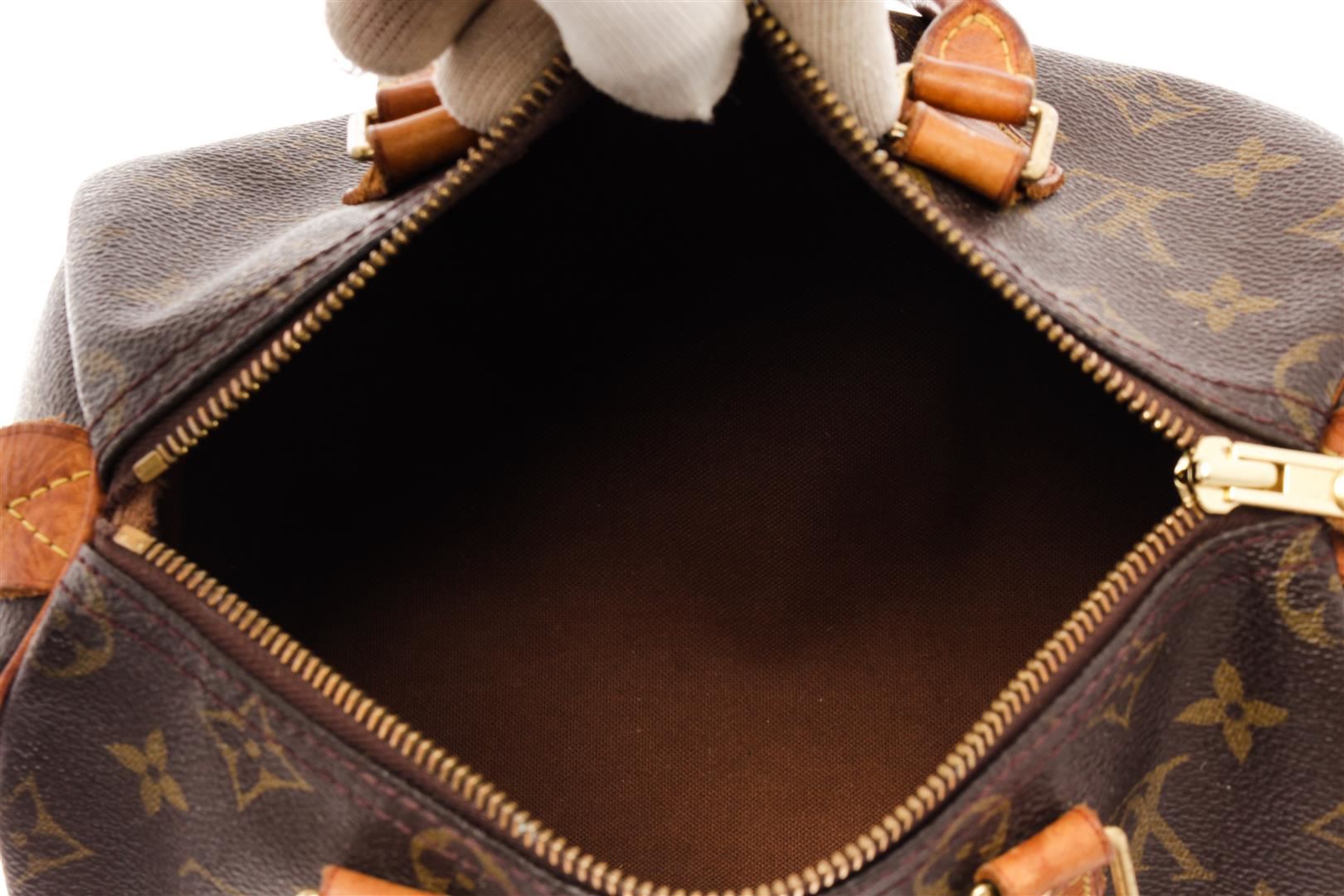 Louis Vuitton Brown Monogram Canvas Speedy 25 Satchel Bag. All available information is listed in the description and shown in the photos. Louis Vuitton Brown Monogram Canvas Speedy 25 Satchel Bag with brass hardware, leather trim, rolled handles, canvas lining & single interior pocket, zip closure at top. Height: 7.25" Width: 10" Depth: 5.5", Handle Drop: 3" / 18.41 x 25.4 x 13.97 Cm