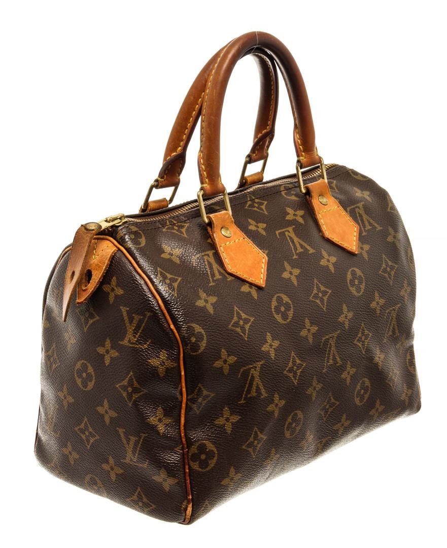 One Louis Vuitton Brown Monogram Canvas Speedy 25cm Satchel Bag. Item is sold AS-IS. All available information is listed in the description and shown in the photo. Louis Vuitton Brown Monogram Canvas Speedy 25cm Satchel Bag with top handle, exterior graphic, gold tone hardware, canvas lining, zipper closure. 9.84"L x 7.48"W x 5.7"H, (HxWxD): 19cm x 25cm x 14.5cm