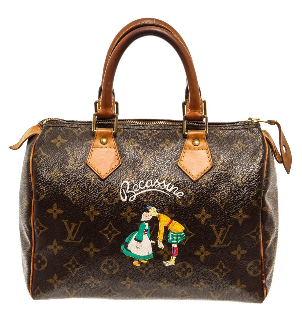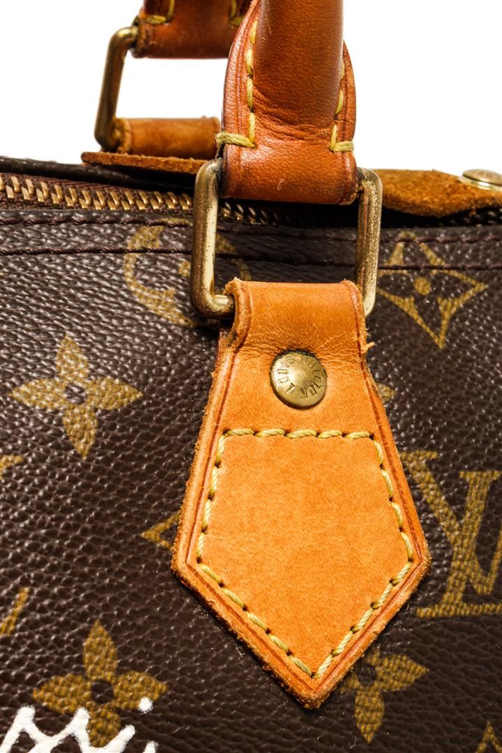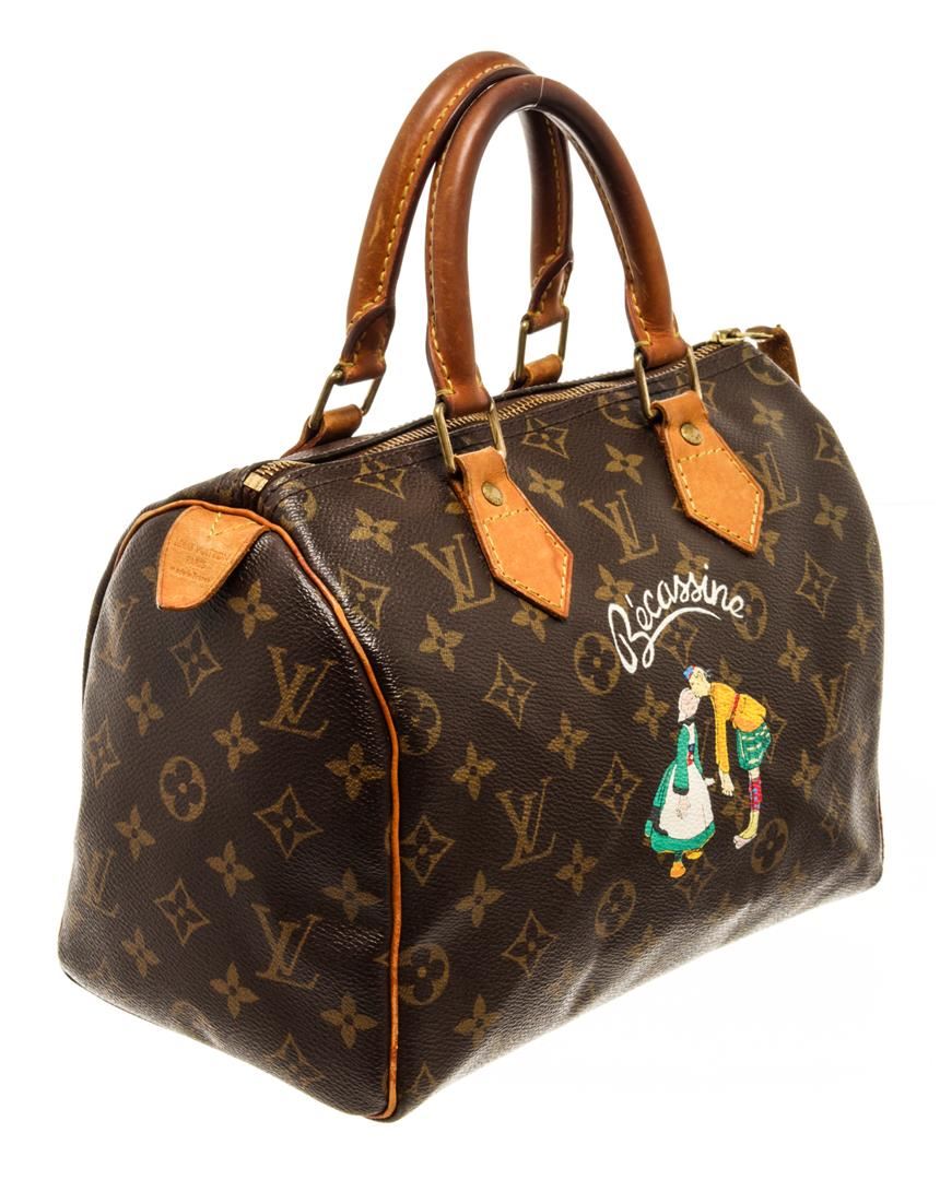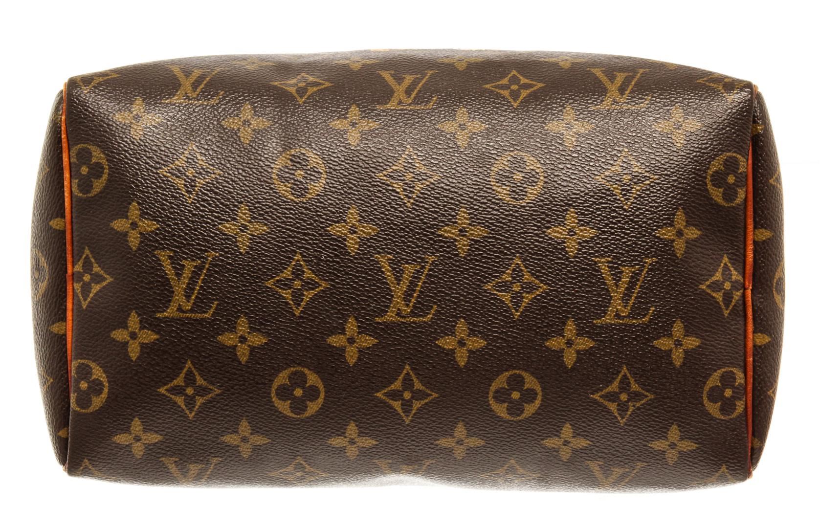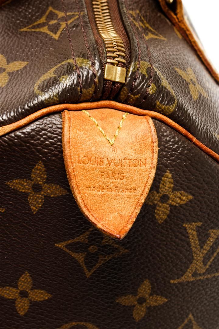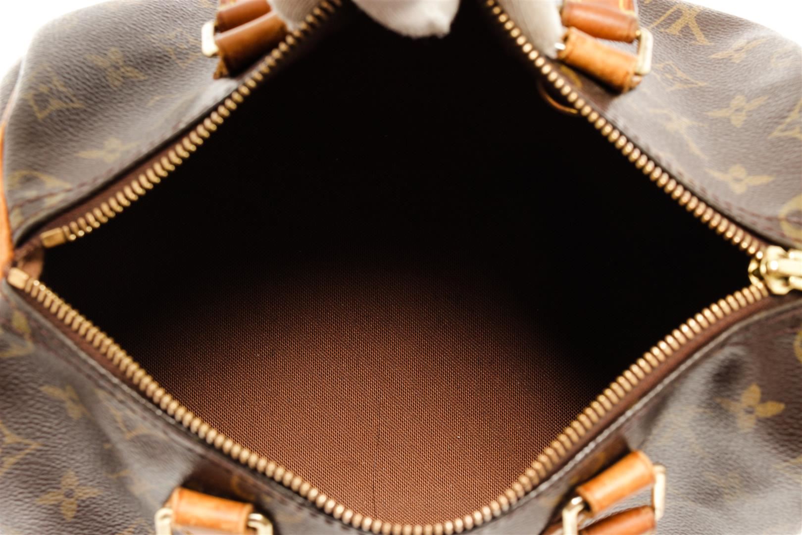 One Louis Vuitton Brown Monogram Canvas Speedy 25cm Satchel Bag. Item is sold AS-IS. All available information is listed in the description and shown in the photo. Louis Vuitton Brown Monogram Canvas Speedy 25cm Satchel Bag with top handle, exterior graphic, gold tone hardware, canvas lining, zipper closure. 9.84"L x 7.48"W x 5.7"H, (HxWxD): 19cm x 25cm x 14.5cm