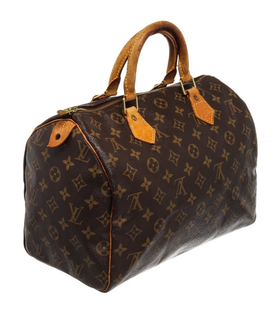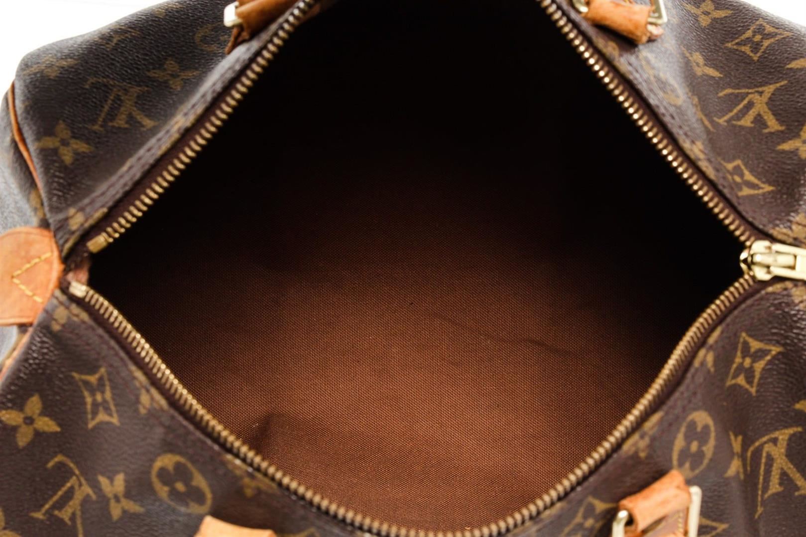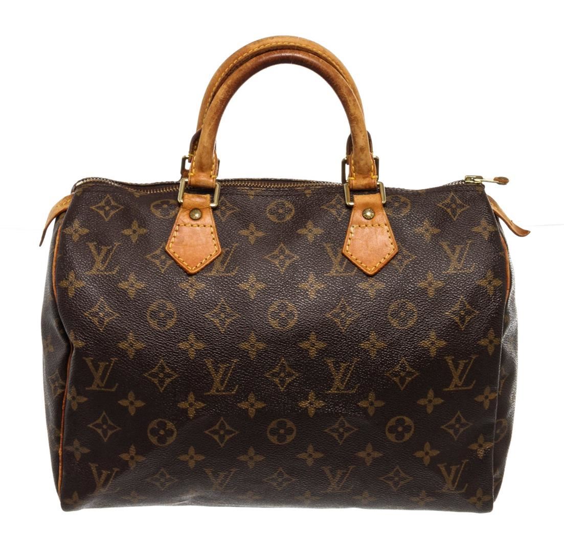 Louis Vuitton Brown Monogram Canvas Speedy 30 Satchel Bag with monogram canvas gold-tone hardware, trim tan vachetta leather, interior slip pocket, dual top handle and zipper closure.