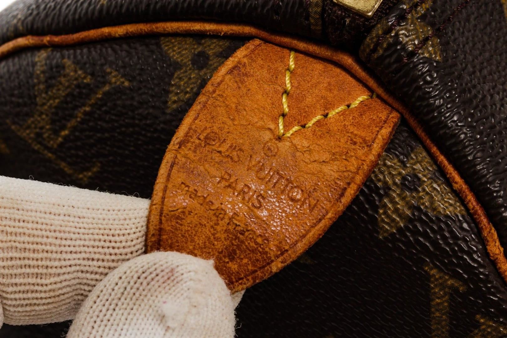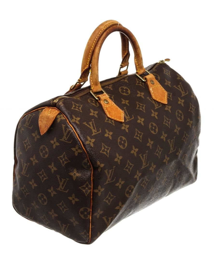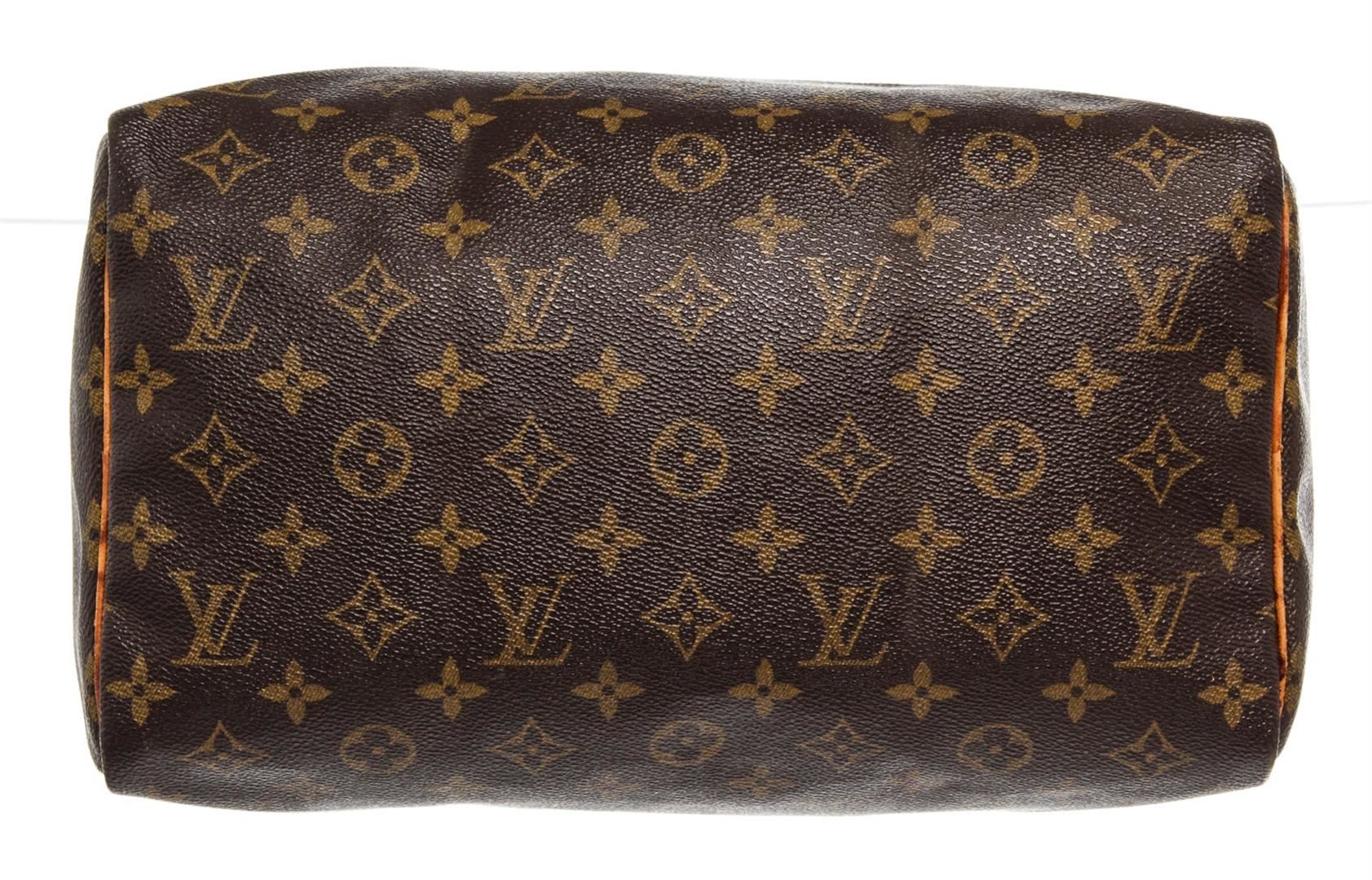 Louis Vuitton Brown Monogram Canvas Speedy 30 Satchel Bag with monogram canvas gold-tone hardware, trim tan vachetta leather, interior slip pocket, dual top handle and zipper closure.