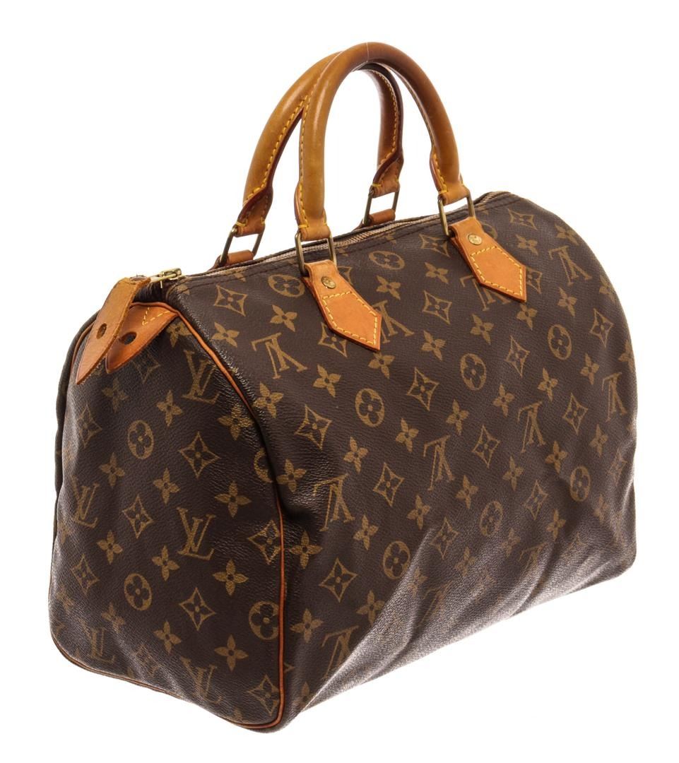 Louis Vuitton Brown Monogram Canvas Speedy 30 Satchel Bag. All available information is listed in the description and shown in the photos. Louis Vuitton Brown Monogram Canvas Speedy 30 Satchel Bag with brass hardware, leather trim, dual rolled handles, leather trim embellishment, canvas lining & single interior pocket, zip closure at top. Height: 8.5" Width: 12" Depth: 7", Handle Drop: 4" / 21.59 x 30.48 x 17.78 Cm