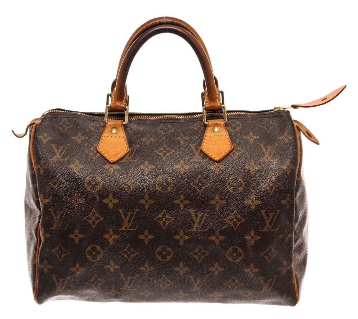 Louis Vuitton Brown Monogram Canvas Speedy 30 Satchel Bag. All available information is listed in the description and shown in the photos. Louis Vuitton Brown Monogram Canvas Speedy 30 Satchel Bag with brass hardware, leather trim, dual rolled handles, leather trim embellishment, canvas lining & single interior pocket, zip closure at top. Height: 8.5" Width: 12" Depth: 6.5", Handle Drop: 3.25" / 21.59 x 30.48 x 16.51 Cm