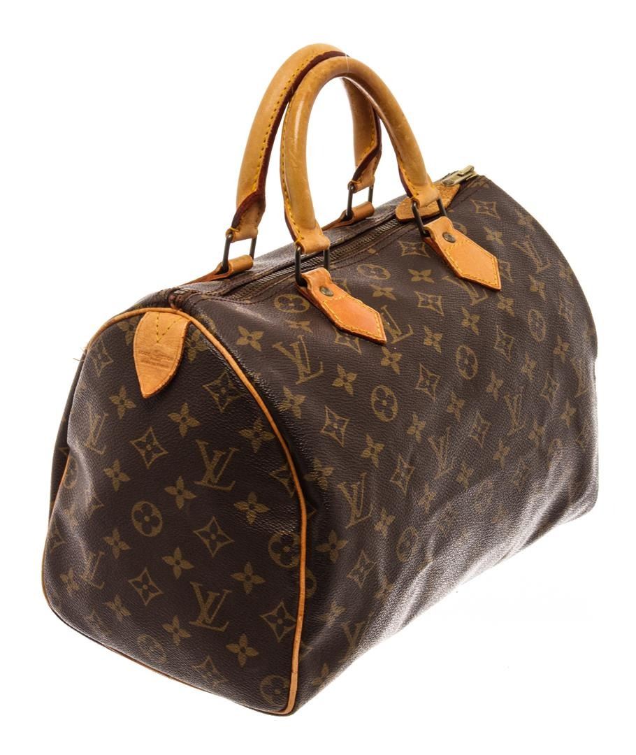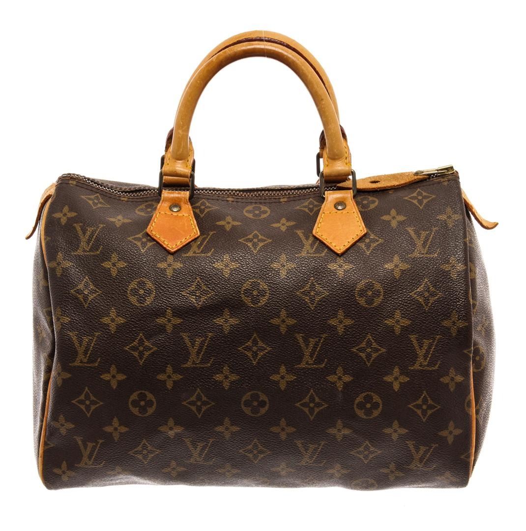 Louis Vuitton Brown Monogram Canvas Speedy 30 Satchel Bag. All available information is listed in the description and shown in the photos. Louis Vuitton Brown Monogram Canvas Speedy 30 Satchel Bag with brass hardware, leather trim, dual rolled handles, leather trim embellishment, canvas lining & single interior pocket, zip closure at top.        Height: 8.5" Width: 12.5" Depth: 7", Handle Drop: 3.5" / 21.59 x 31.75 x 17.78 Cm