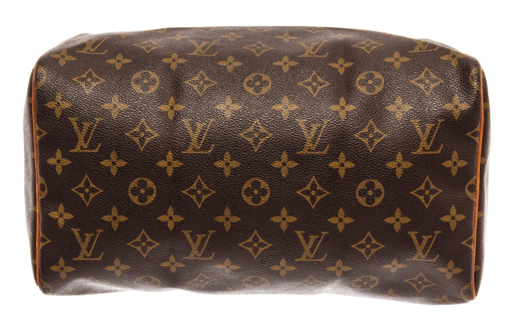 Louis Vuitton Brown Monogram Canvas Speedy 30 Satchel Bag. All available information is listed in the description and shown in the photos. Louis Vuitton Brown Monogram Canvas Speedy 30 Satchel Bag with brass hardware, leather trim, rolled handles & single shoulder strap, leather trim embellishment, canvas lining & single interior pocket, zip closure at top. Height: 9.5" Width: 11.5" Depth: 7", Shoulder Strap Drop: 3" / 24.13 x 29.21 x 17.78 Cm