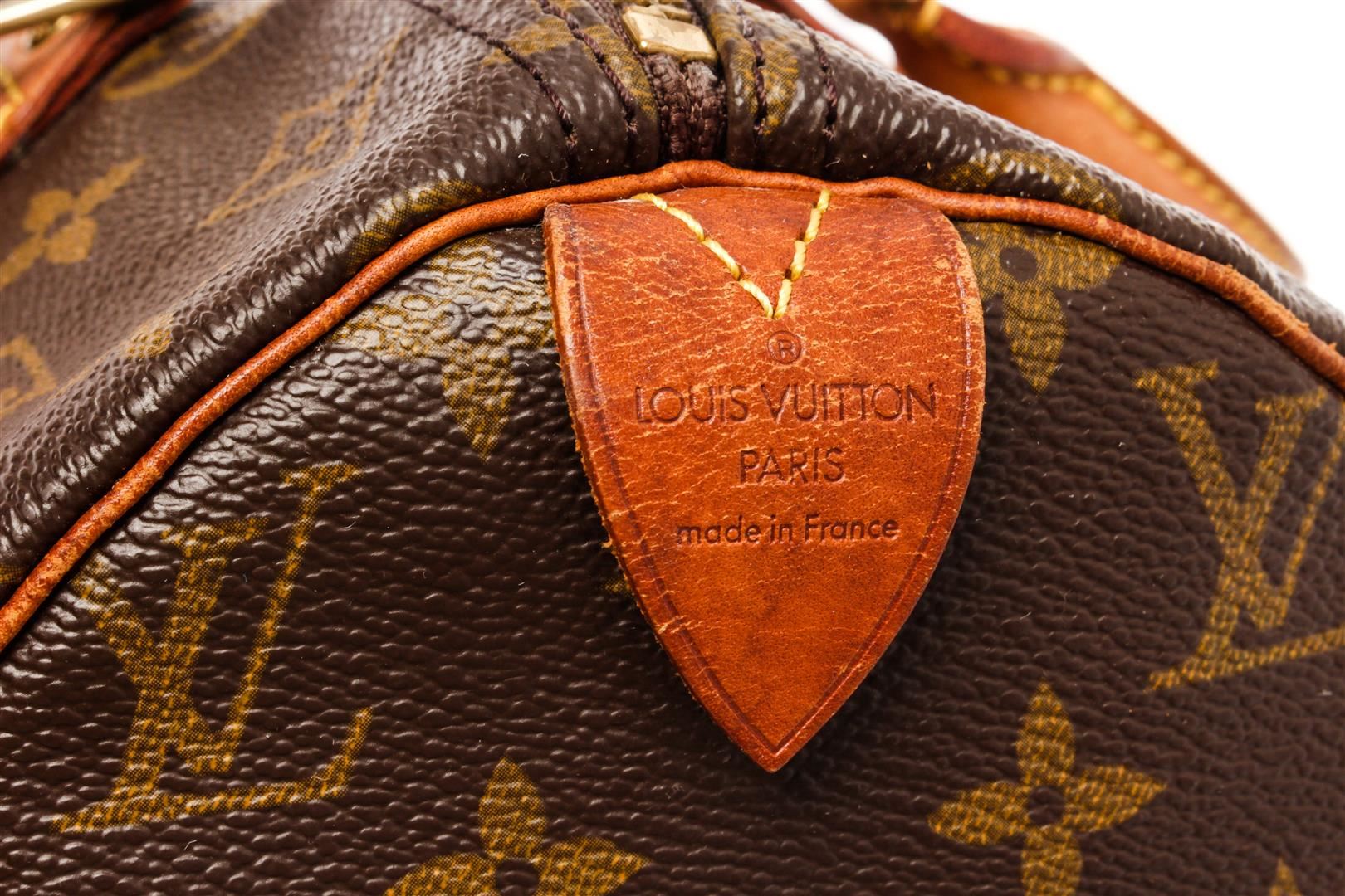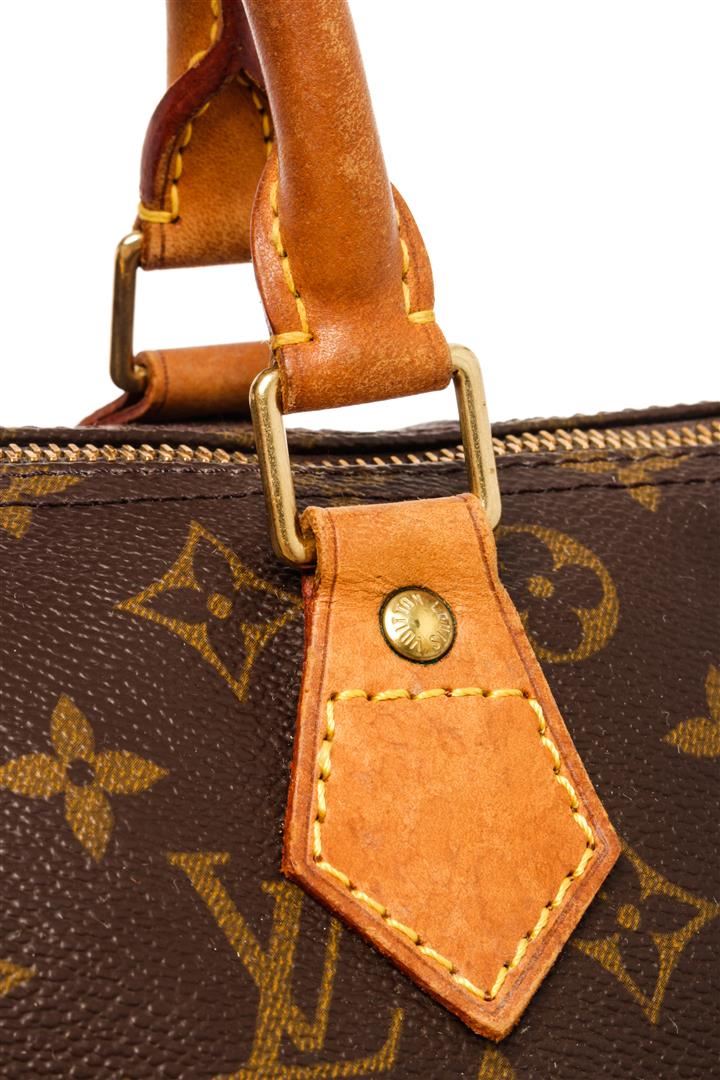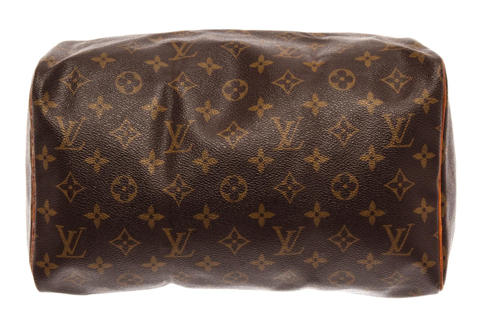 Louis Vuitton Brown Monogram Canvas Speedy 30 Satchel Bag. All available information is listed in the description and shown in the photos. Louis Vuitton Brown Monogram Canvas Speedy 30 Satchel Bag with brass hardware, leather trim, dual rolled handles, leather trim embellishment, canvas lining & single interior pocket, zip closure at top. Height: 10" Width: 12" Depth: 6.5", Handle Drop: 3" / 25.4 x 30.48 x 16.51 Cm