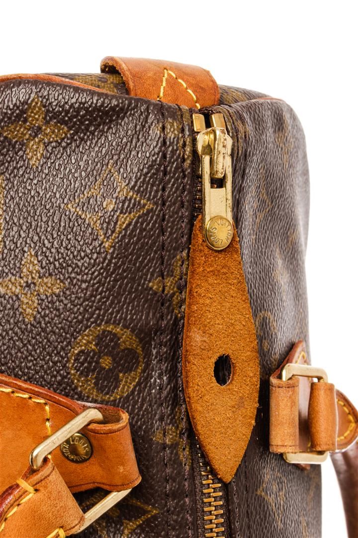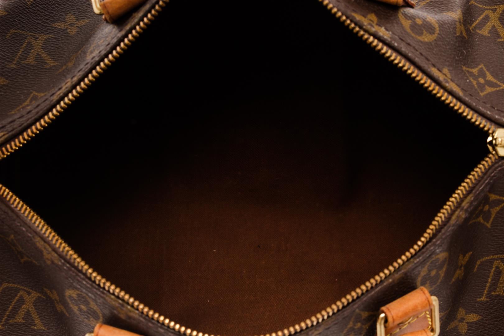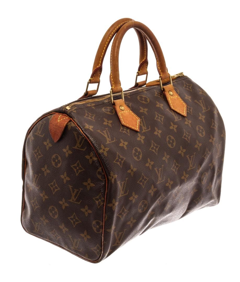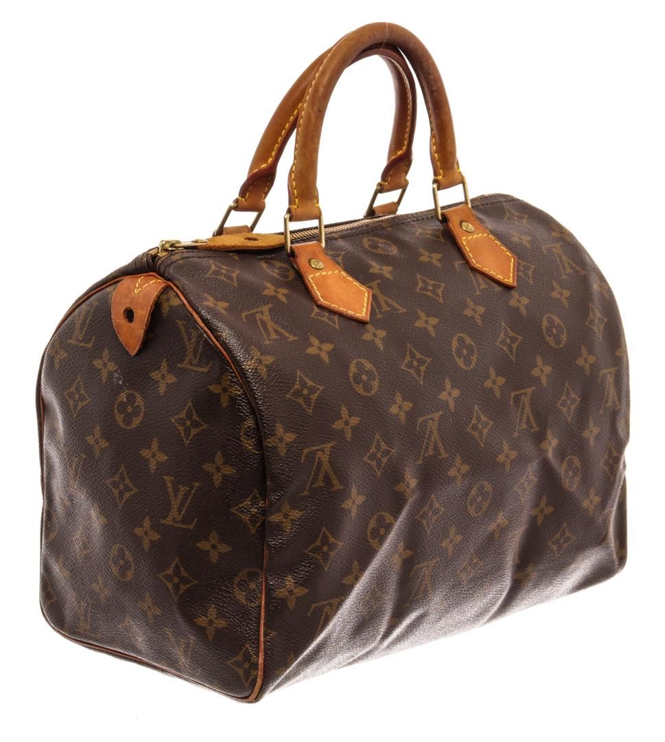 Louis Vuitton Brown Monogram Canvas Speedy 30 Satchel Bag. All available information is listed in the description and shown in the photos. Louis Vuitton Brown Monogram Canvas Speedy 30 Satchel Bag with brass hardware, leather trim, dual rolled handles, leather trim embellishment, canvas lining & single interior pocket, zip closure at top. Height: 10" Width: 12" Depth: 6.5", Handle Drop: 3" / 25.4 x 30.48 x 16.51 Cm