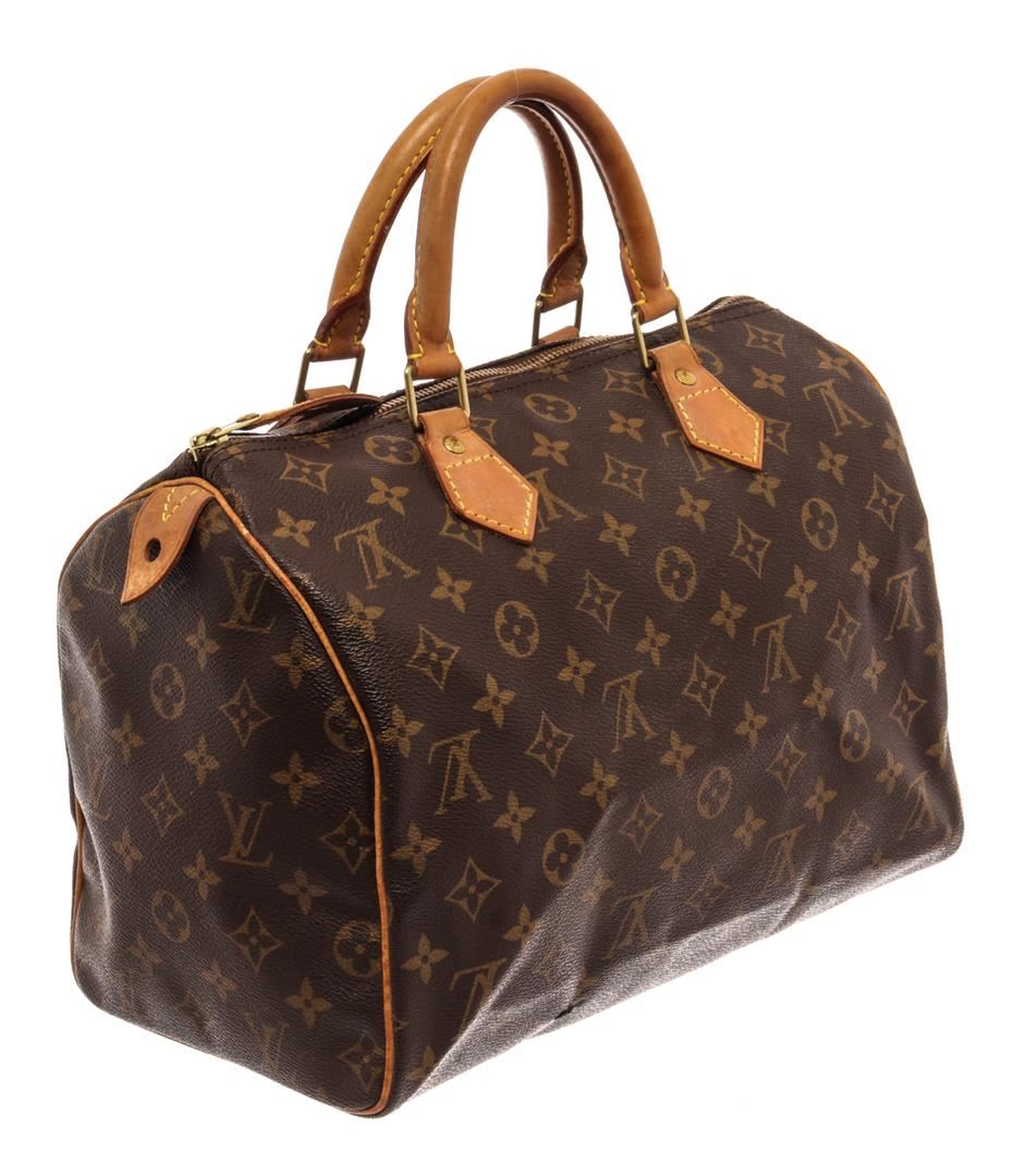 Louis Vuitton Brown Monogram Canvas Speedy 30 Satchel Bag. All available information is listed in the description and shown in the photos. Louis Vuitton Brown Monogram Canvas Speedy 30 Satchel Bag with brass hardware, leather trim, dual rolled handles, leather trim embellishment, canvas lining & single interior pocket, zip closure at top. Height: 8.5" Width: 12" Depth: 6.5", Handle Drop: 3.25" / 21.59 x 30.48 x 16.51 Cm