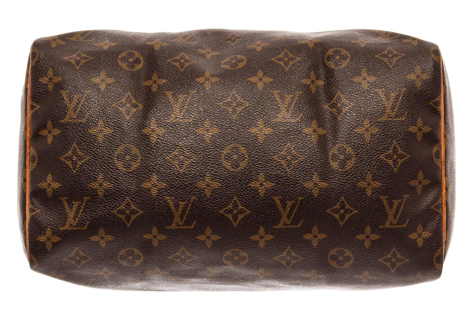 Louis Vuitton Brown Monogram Canvas Speedy 30 Satchel Bag. All available information is listed in the description and shown in the photos. Louis Vuitton Brown Monogram Canvas Speedy 30 Satchel Bag with monogram pattern, brass hardware, leather trim, rolled handles, leather trim embellishment, canvas lining & single interior pocket, zip closure at top. Height: 8.25" Width: 12.75" Depth: 6.75", Handle Drop: 3.5" / 20.95 x 32.38 x 17.14 Cm