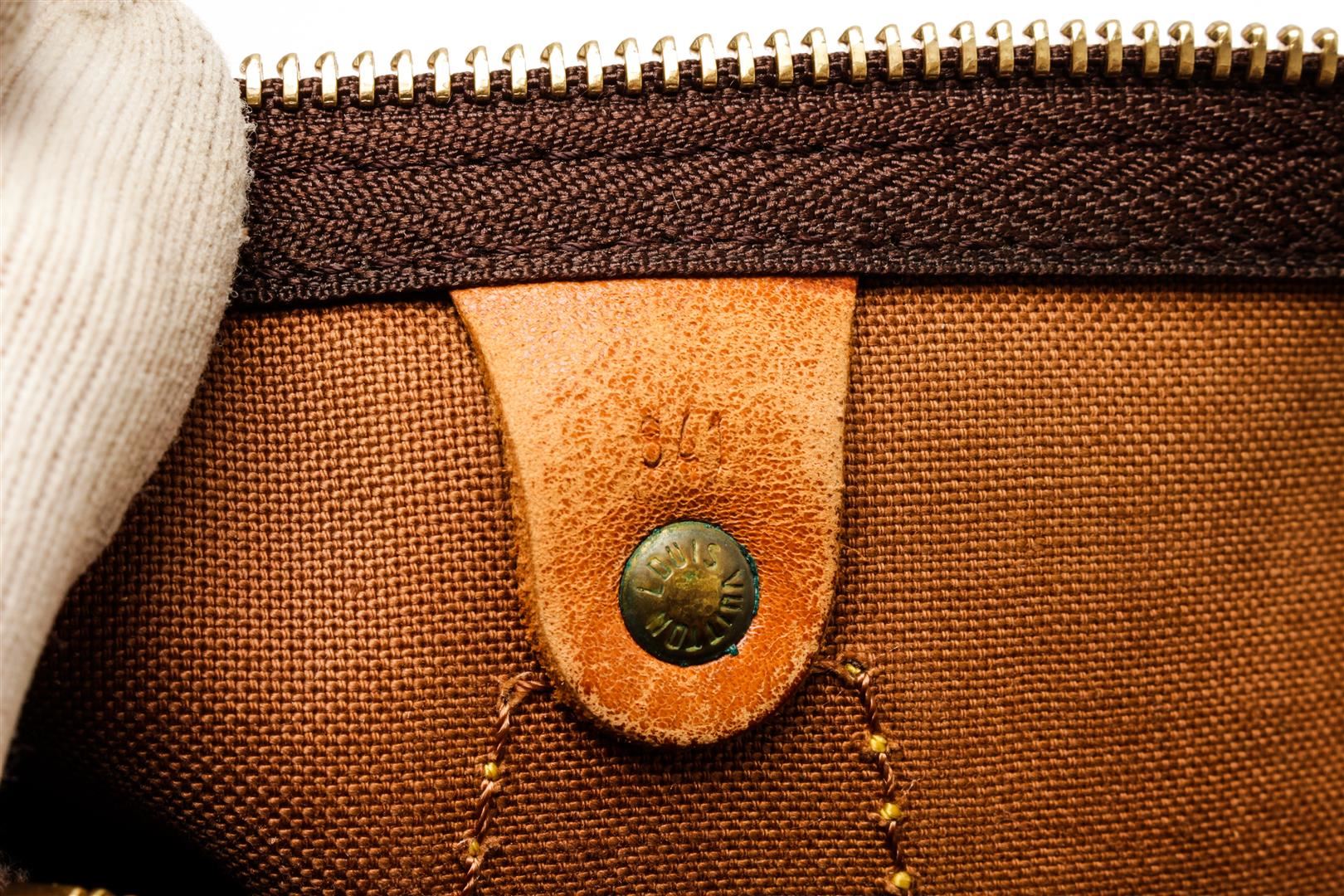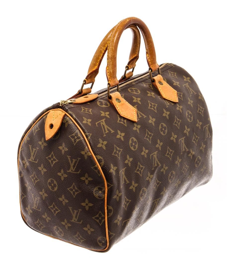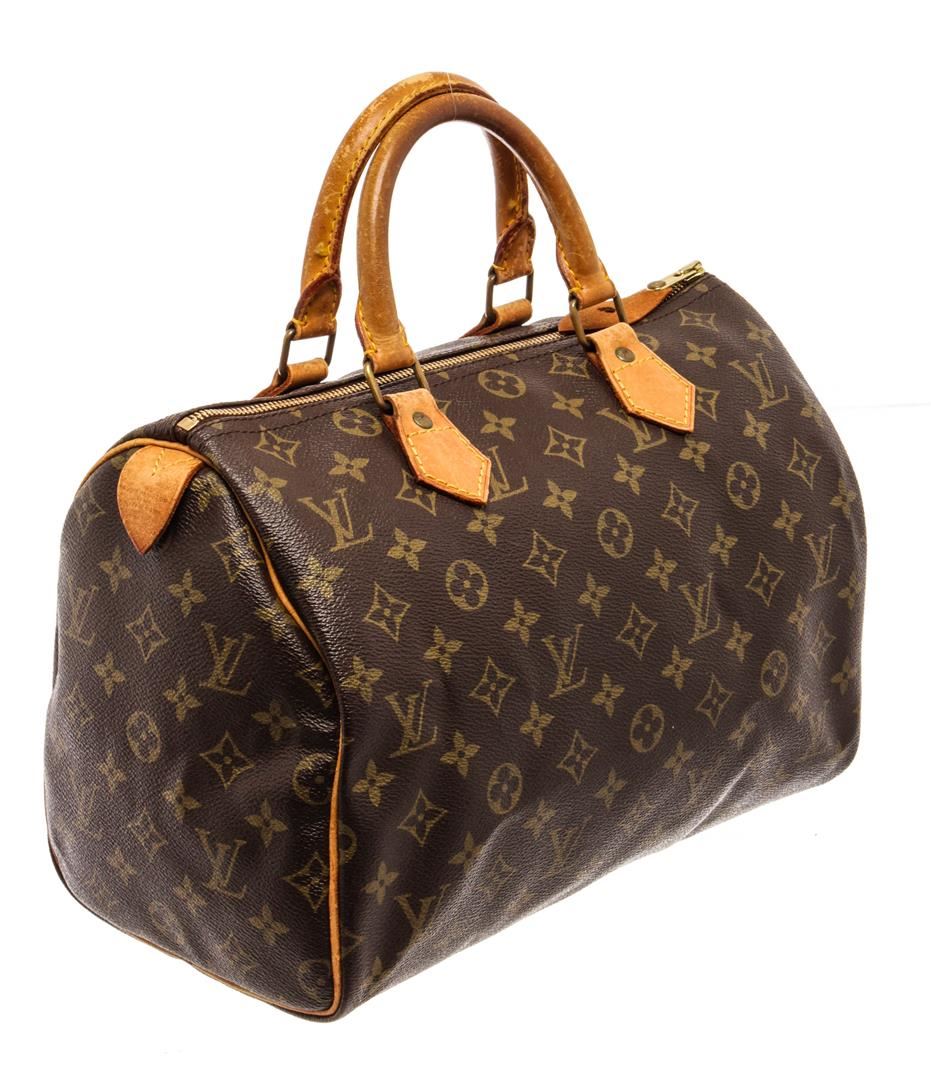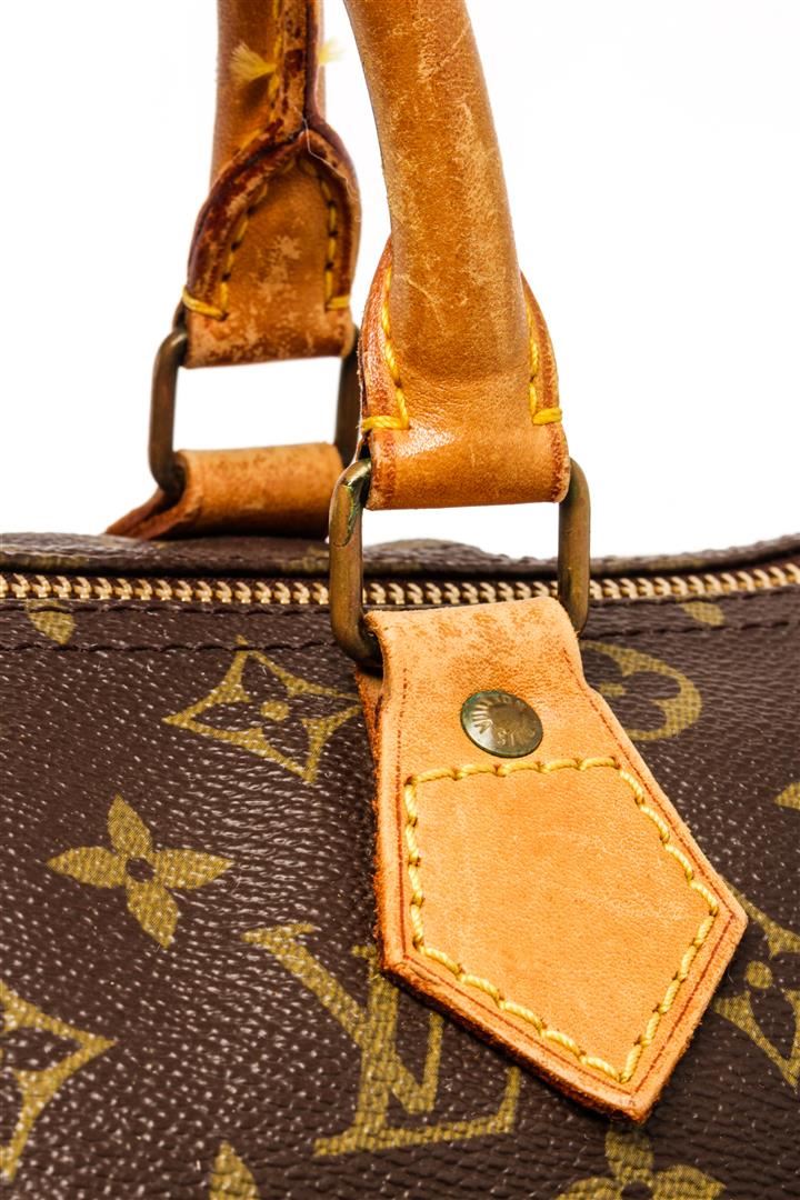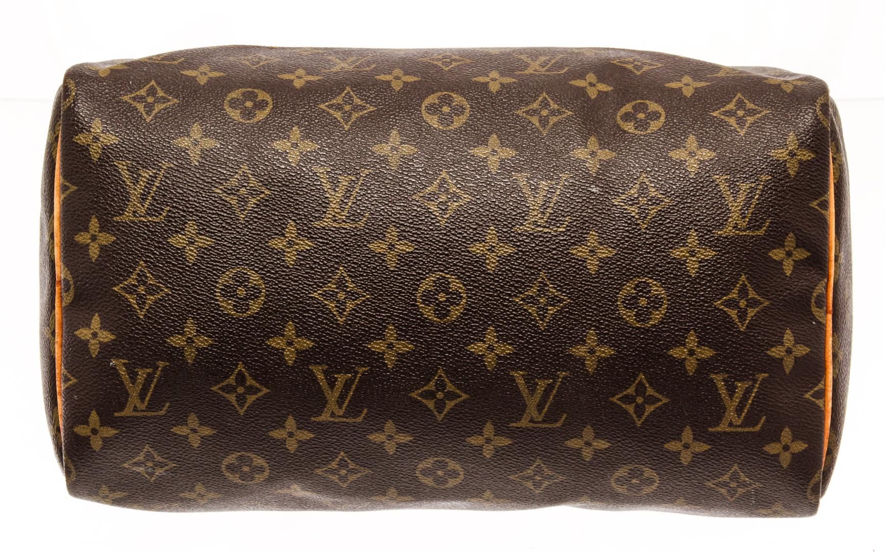 Louis Vuitton Brown Monogram Canvas Speedy 30 Satchel Bag. All available information is listed in the description and shown in the photos. Louis Vuitton Brown Monogram Canvas Speedy 30 Satchel Bag with gold-tone hardware, internal slip pocket, leather trim, two rolled top handles, main compartment top zip fastening. Height: 9.8 in (24.9 cm), Width: 15 in (38.1 cm), Depth: 7.5 in (19.05 cm)