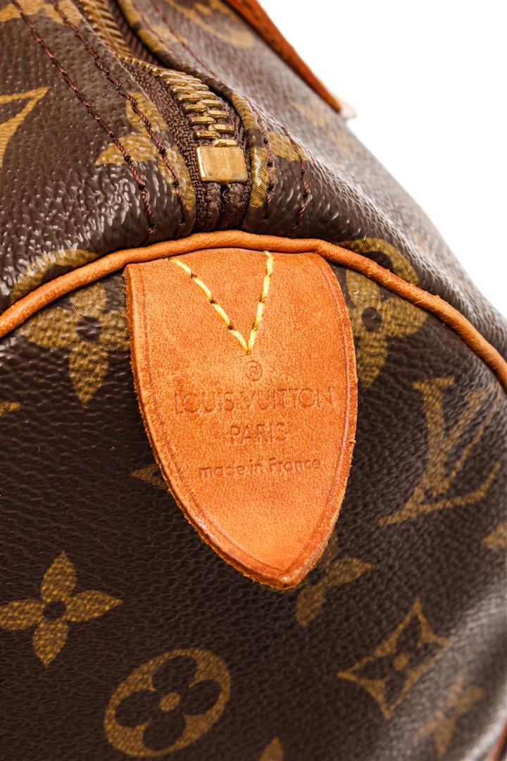 Louis Vuitton Brown Monogram Canvas Speedy 30 Satchel Bag. All available information is listed in the description and shown in the photos. Louis Vuitton Brown Monogram Canvas Speedy 30 Satchel Bag with brass hardware, leather trim, dual rolled handles, leather trim embellishment, canvas lining & single interior pocket, zip closure at top. Height: 8.5" Width: 12" Depth: 7", Handle Drop: 4" / 21.59 x 30.48 x 17.78 Cm