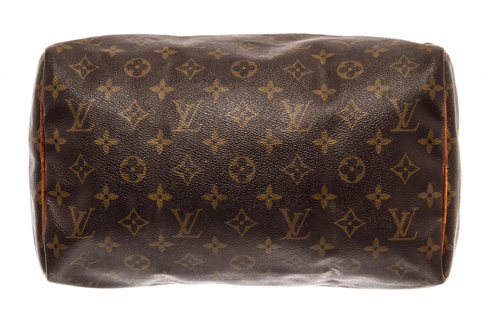 Louis Vuitton Brown Monogram Canvas Speedy 30 Satchel Bag. All available information is listed in the description and shown in the photos. Louis Vuitton Brown Monogram Canvas Speedy 30 Satchel Bag with brass hardware, leather trim, dual rolled handles, canvas lining & single interior pocket, zip closure at top. Height: 10.5" Width: 12" Depth: 6.5", Handle Drop: 3.5" / 26.67 x 30.48 x 16.51 Cm