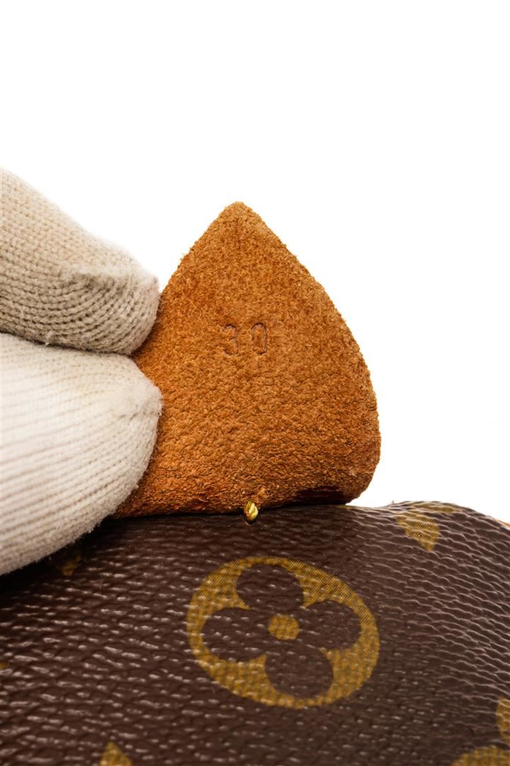 Louis Vuitton Brown Monogram Canvas Speedy 30cm Satchel Bag. All available information is listed in the description and shown in the photos. Louis Vuitton Brown Monogram Canvas Speedy 30cm Satchel Bag with gold-tone hardware, leather trim, rolled handles, leather trim embellishment, canvas lining & single interior pocket, zip closure at top. Height: 8.75" Width: 11.75" Depth: 7", Handle Drop: 3.5" / 22.22 x 29.84 x 17.78 Cm
