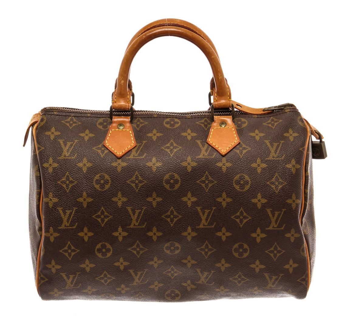 Louis Vuitton Brown Monogram Canvas Speedy 30cm Satchel Bag. All available information is listed in the description and shown in the photos. Louis Vuitton Brown Monogram Canvas Speedy 30cm Satchel Bag with gold-tone hardware, leather trim, rolled handles, leather trim embellishment, canvas lining & single interior pocket, zip closure at top. Height: 8.75" Width: 11.75" Depth: 7", Handle Drop: 3.5" / 22.22 x 29.84 x 17.78 Cm