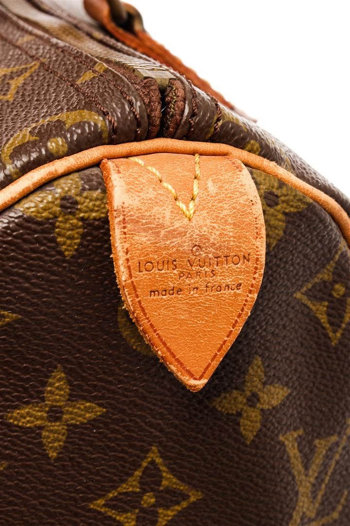 Louis Vuitton Brown Monogram Canvas Speedy 30cm Satchel Bag. All available information is listed in the description and shown in the photos. Louis Vuitton Brown Monogram Canvas Speedy 30cm Satchel Bag with gold-tone hardware, leather trim, rolled handles, leather trim embellishment, canvas lining & single interior pocket, zip closure at top. Height: 8.75" Width: 11.75" Depth: 7", Handle Drop: 3.5" / 22.22 x 29.84 x 17.78 Cm