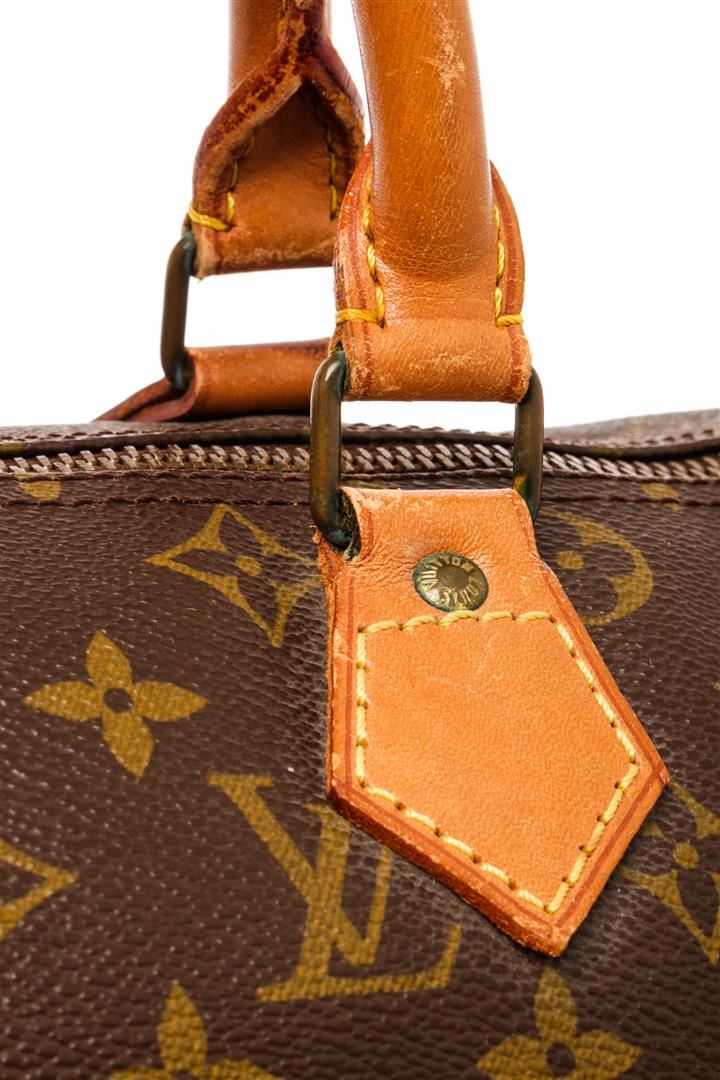 Louis Vuitton Brown Monogram Canvas Speedy 30cm Satchel Bag. All available information is listed in the description and shown in the photos. Louis Vuitton Brown Monogram Canvas Speedy 30cm Satchel Bag with gold-tone hardware, leather trim, rolled handles, leather trim embellishment, canvas lining & single interior pocket, zip closure at top. Height: 8.75" Width: 11.75" Depth: 7", Handle Drop: 3.5" / 22.22 x 29.84 x 17.78 Cm