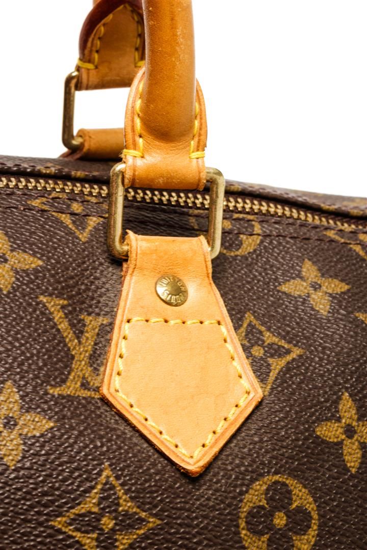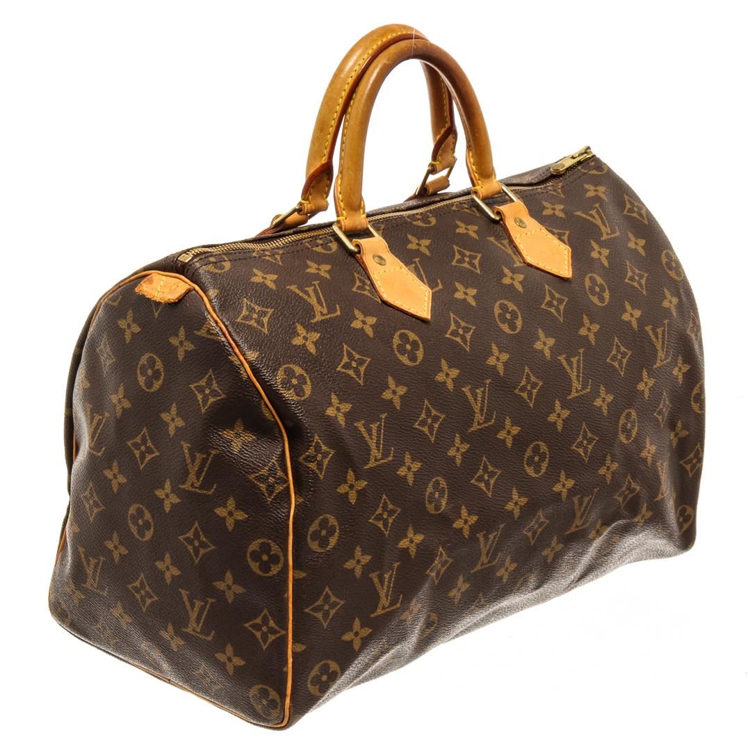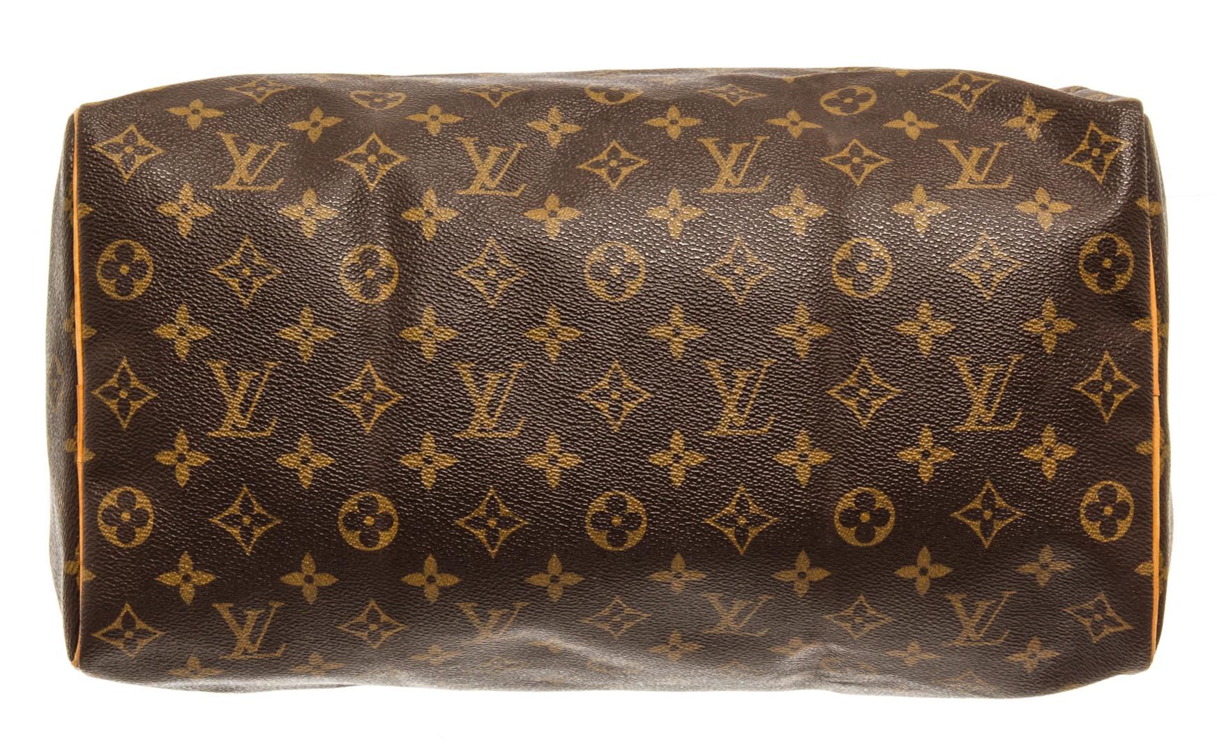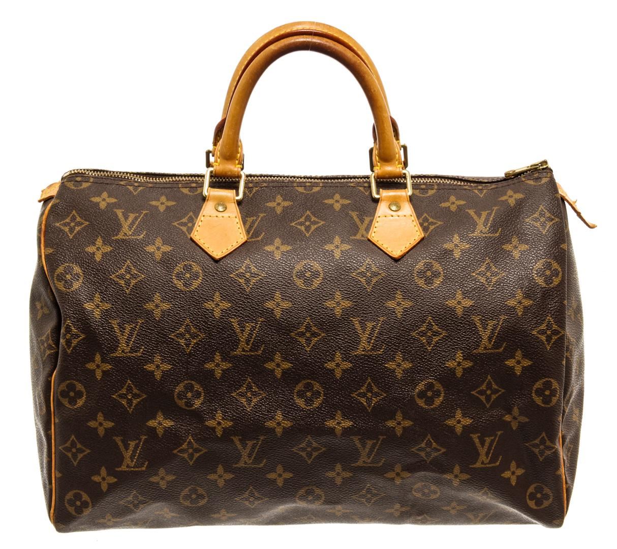 One Louis Vuitton Brown Monogram Canvas Speedy 35 Handbag. Item is sold AS-IS. All available information is listed in the description and shown in the photo. Louis Vuitton Brown Monogram Canvas Speedy 35 Handbag with antiqued gold-tone hardware, leather trim, rolled handles, leather trim embellishment, canvas lining & single interior pocket, zip closure at top Height: 8.5" Width: 12.5" Depth: 6.5" Handle Drop: 4"