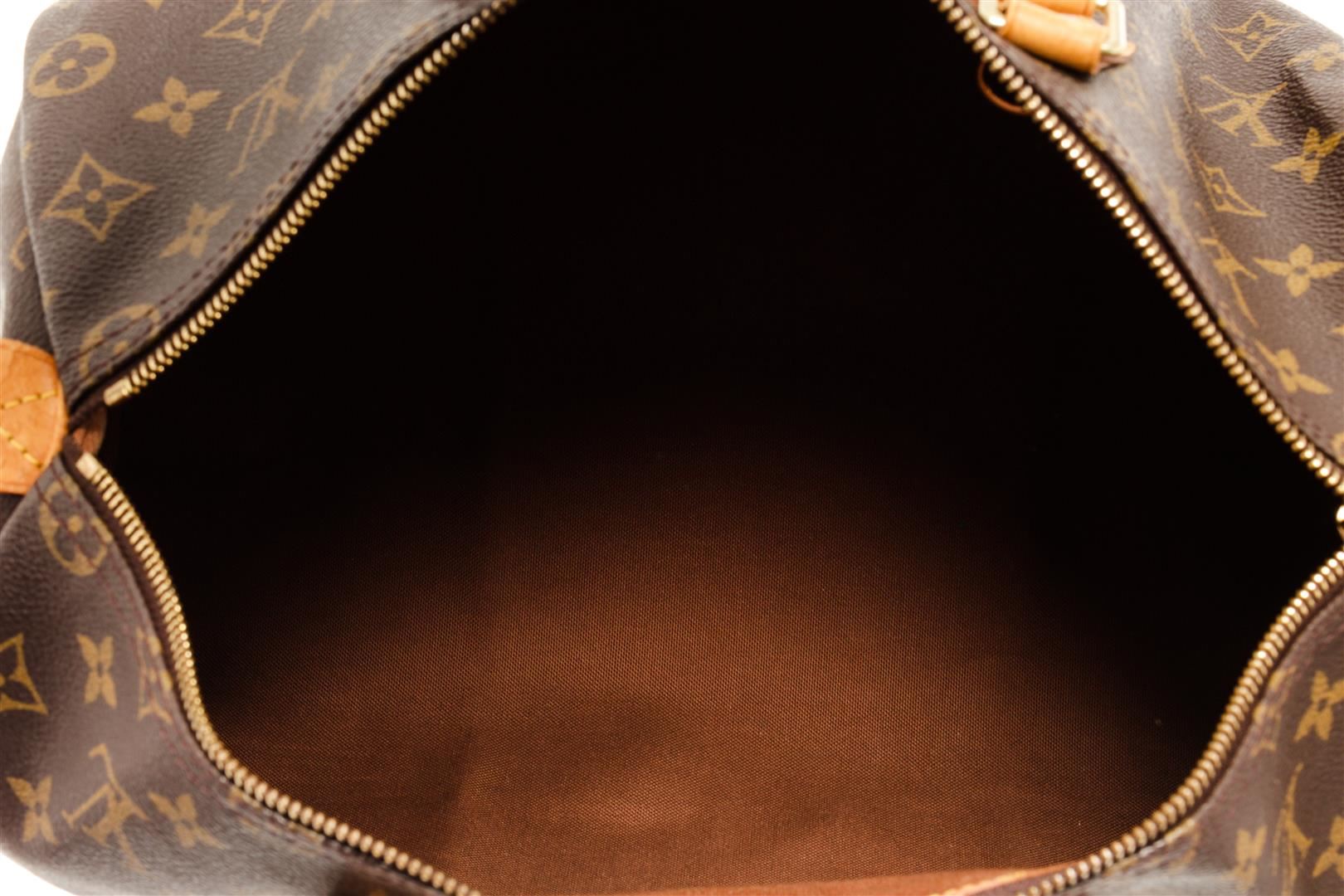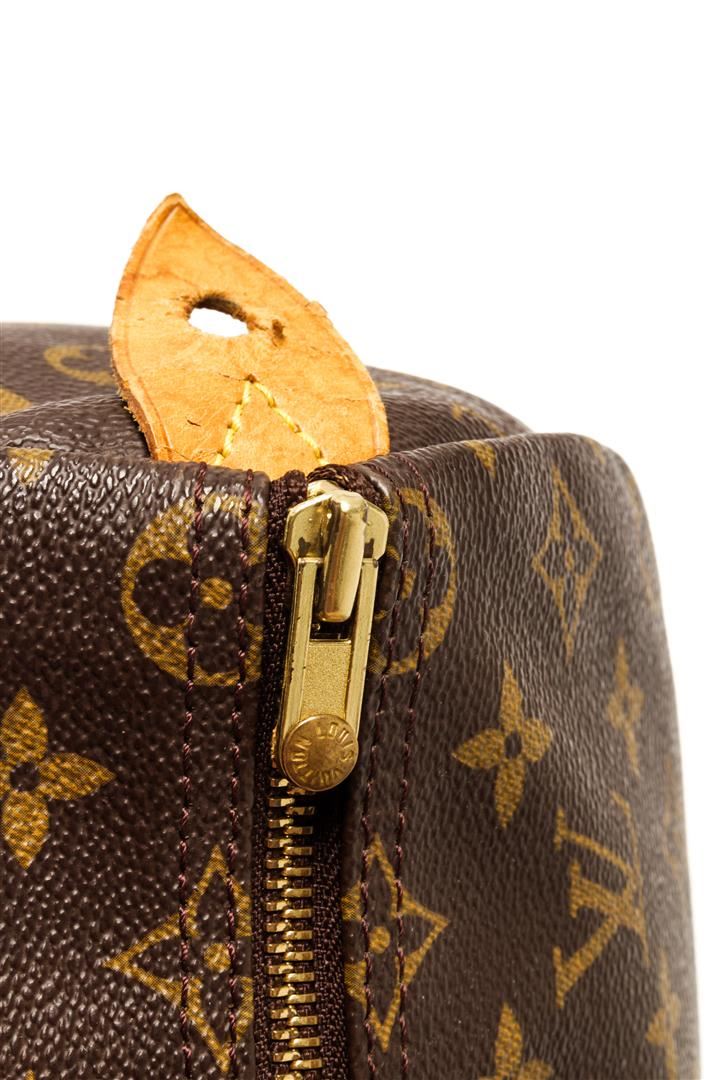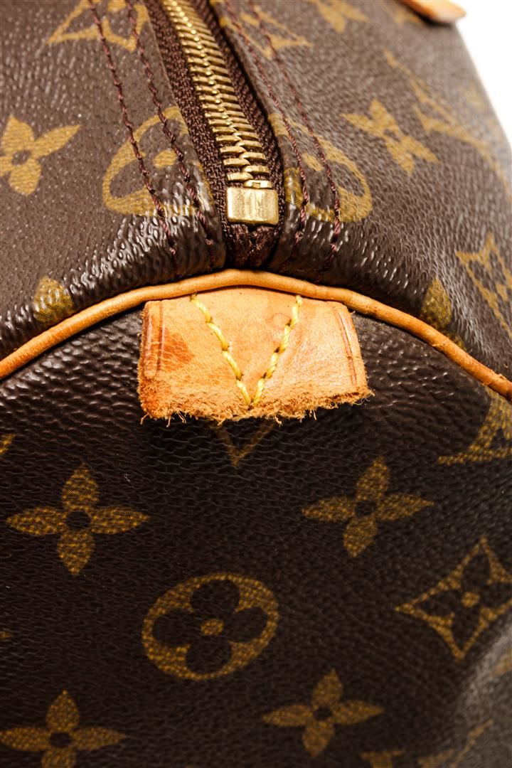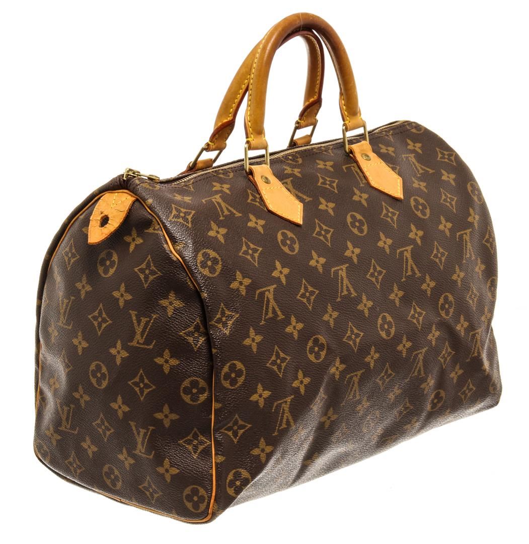 One Louis Vuitton Brown Monogram Canvas Speedy 35 Handbag. Item is sold AS-IS. All available information is listed in the description and shown in the photo. Louis Vuitton Brown Monogram Canvas Speedy 35 Handbag with antiqued gold-tone hardware, leather trim, rolled handles, leather trim embellishment, canvas lining & single interior pocket, zip closure at top Height: 8.5" Width: 12.5" Depth: 6.5" Handle Drop: 4"