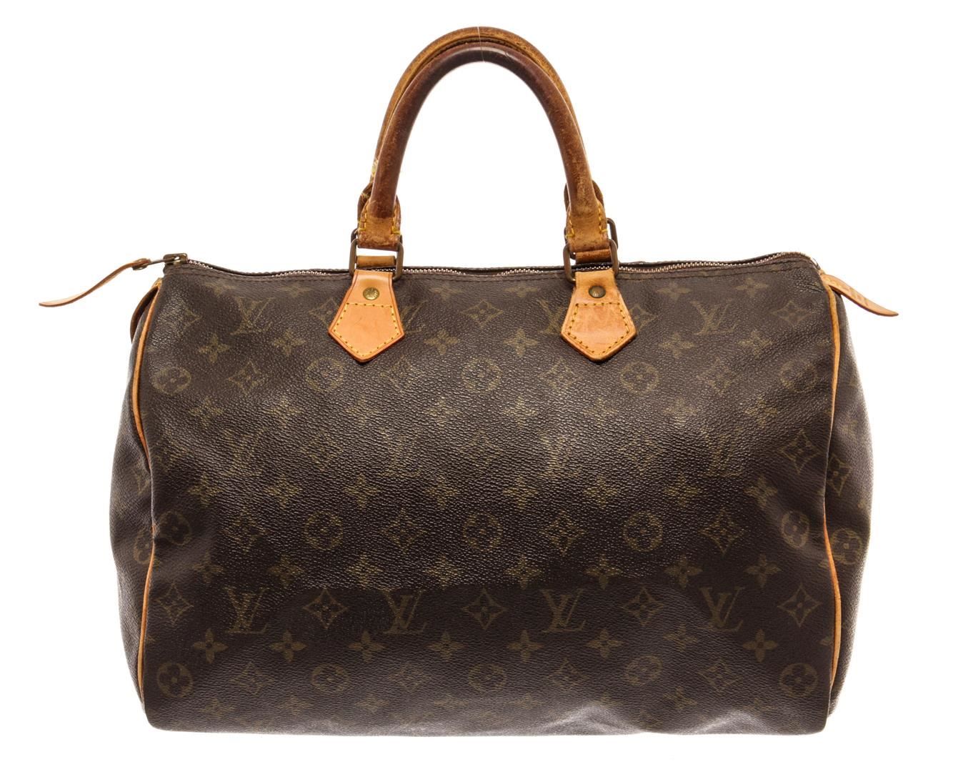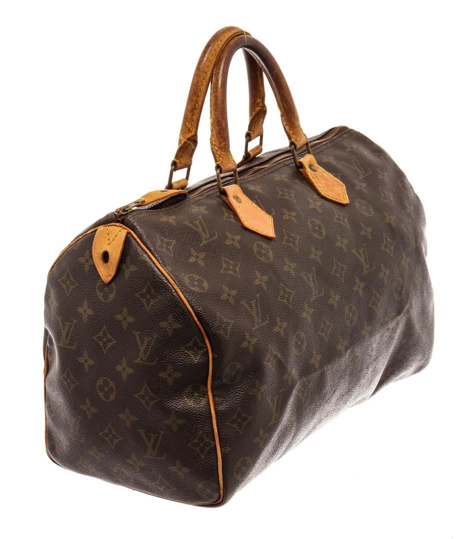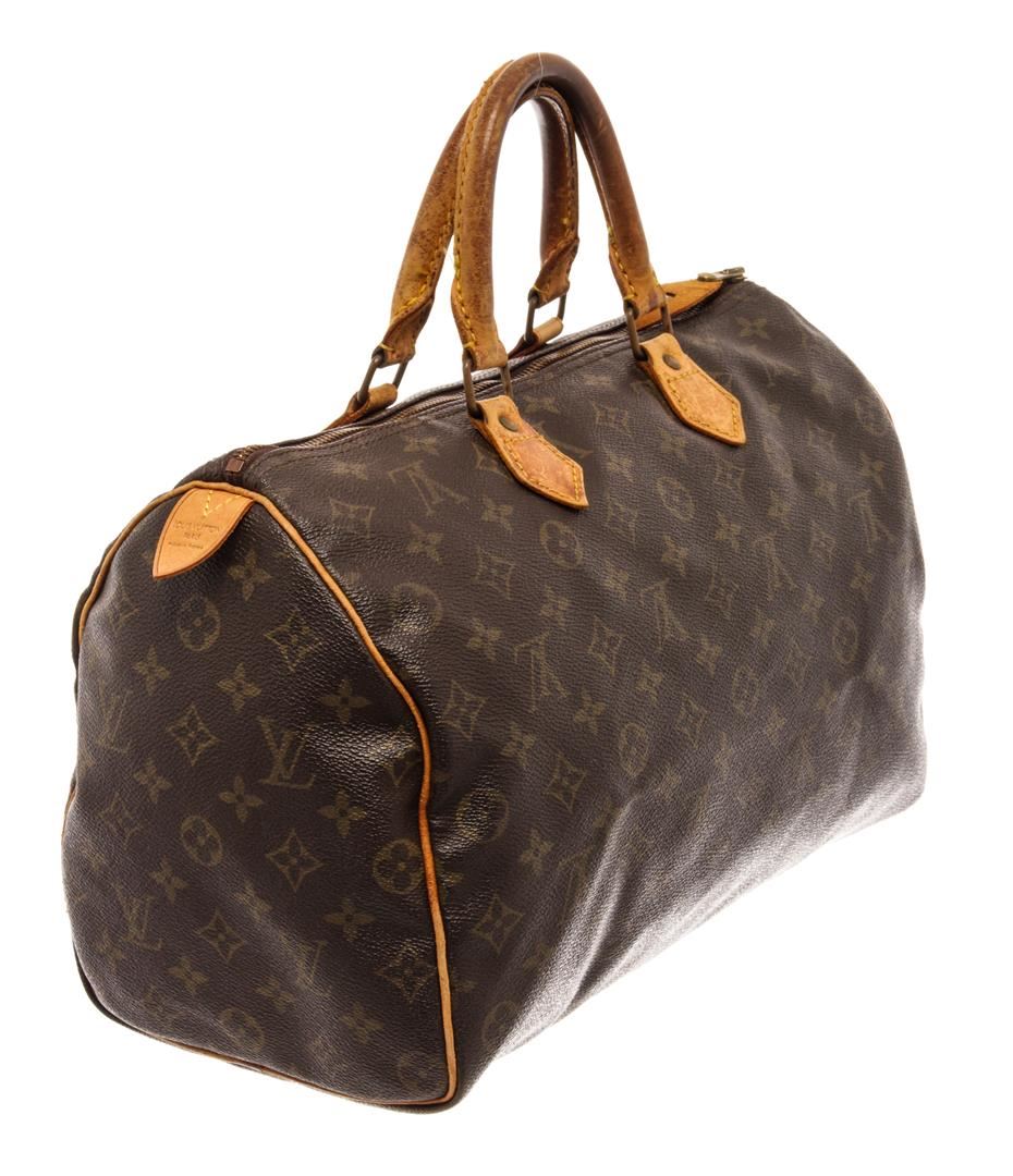 Louis Vuitton Brown Monogram Canvas Speedy 35 Satchel Bag. All available information is listed in the description and shown in the photos. Louis Vuitton Brown Monogram Canvas Speedy 35 Satchel Bag with brass hardware, dual rolled handles, leather trim embellishment, canvas lining & single interior pocket, zip closure at top. Height: 10.75" Width: 13" Depth: 7", Handle Drop: 3.75" / 27.30 x 33.02 x 17.78 Cm