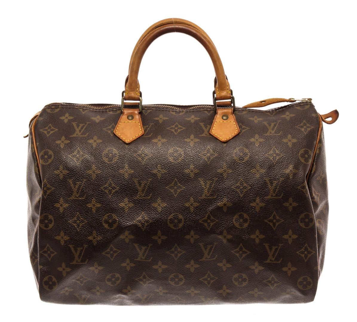 Louis Vuitton Brown Monogram Canvas Speedy 35 Satchel Bag. All available information is listed in the description and shown in the photos. Louis Vuitton Brown Monogram Canvas Speedy 35 Satchel Bag with brown & neutrals, monogram pattern, brass hardware, leather trim, dual rolled handles, leather trim embellishment, canvas lining & single interior pocket, zip closure at top. Height: 10.5" Width: 12" Depth: 7", Handle Drop: 3.5" / 26.67 x 30.48 x 17.78 Cm