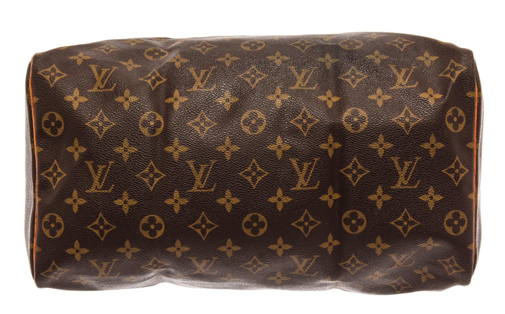 Louis Vuitton Brown Monogram Canvas Speedy 35 Satchel Bag. All available information is listed in the description and shown in the photos. Louis Vuitton Brown Monogram Canvas Speedy 35 Satchel Bag with brass hardware, leather trim, rolled handles, leather trim embellishment, canvas lining & single interior pocket, zip closure at top. Height: 9" Width: 14" Depth: 7.5", Handle Drop: 3.5" / 22.86 x 35.56 x 19.05 Cm