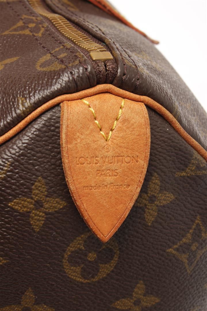 Louis Vuitton Brown Monogram Canvas Speedy 35 Satchel Bag. All available information is listed in the description and shown in the photos. louis vuitton brown monogram canvas speedy 35 bandoulie satchel bag with gold-tone hardware, internal slip pocket, leather trim, two rolled top handles, main compartment top zip fastening. Depth 7.9 in, Handle 3.9 in, Height 9.1 in, Width 13.8 in / Depth 20 cm, Handle 10 cm, Height 23 cm, Width 35 cm