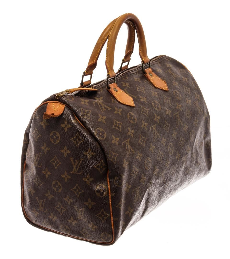 Louis Vuitton Brown Monogram Canvas Speedy 35 Satchel Bag. All available information is listed in the description and shown in the photos. Louis Vuitton Brown Monogram Canvas Speedy 35 Satchel Bag with brown & neutrals, monogram pattern, brass hardware, leather trim, dual rolled handles, leather trim embellishment, canvas lining & single interior pocket, zip closure at top.        Height: 10.5" Width: 12" Depth: 7", Handle Drop: 3.5" / 26.67 x 30.48 x 17.78 Cm