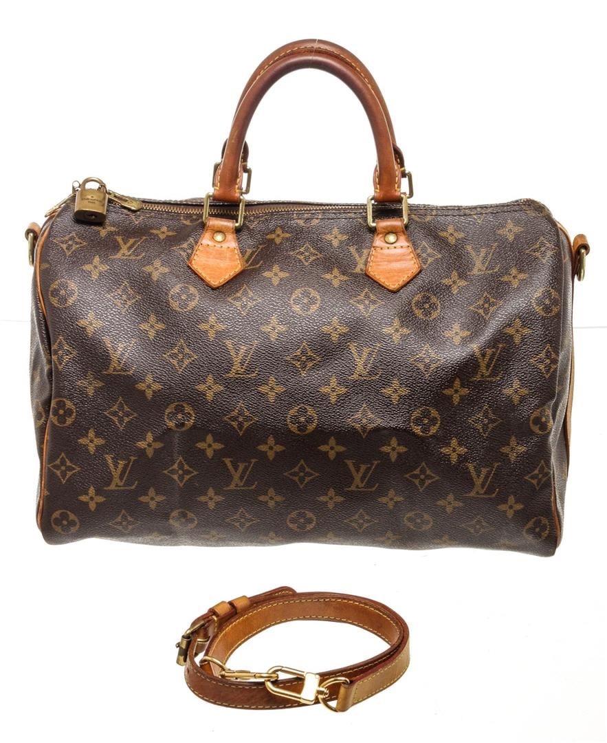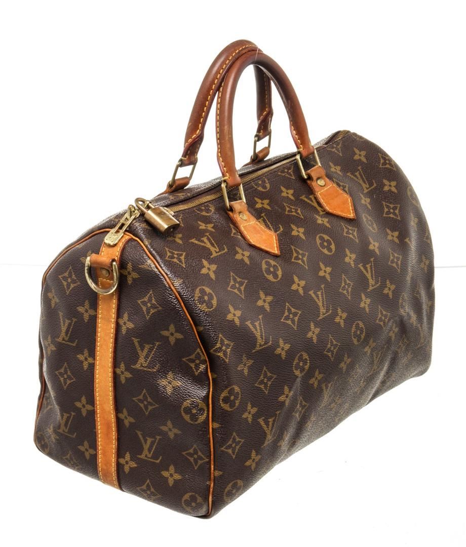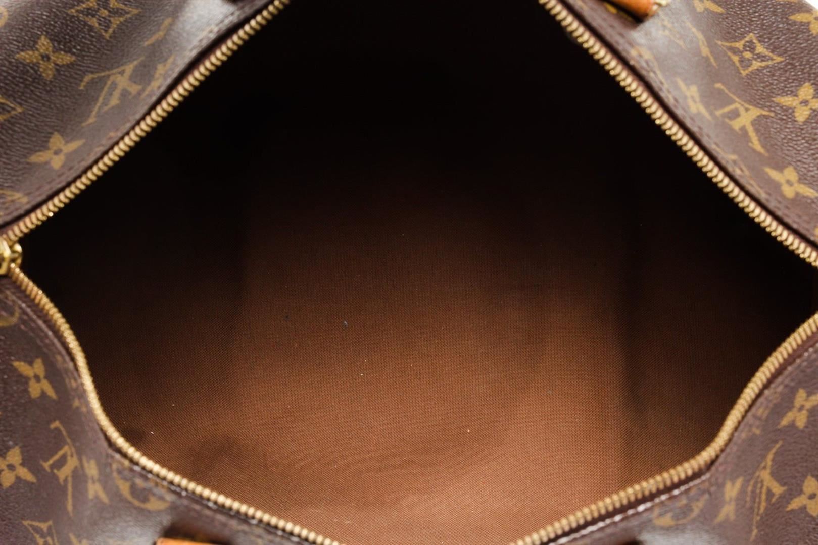 Louis Vuitton Brown Monogram Canvas Speedy 35cm Satchel Bag with monogram canvas gold-tone hardware, trim tan vachetta leather, interior slip pocket, dual top handle and zipper closure.