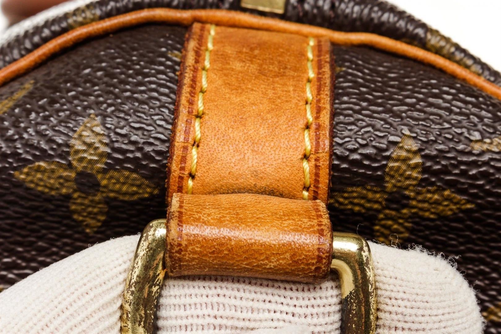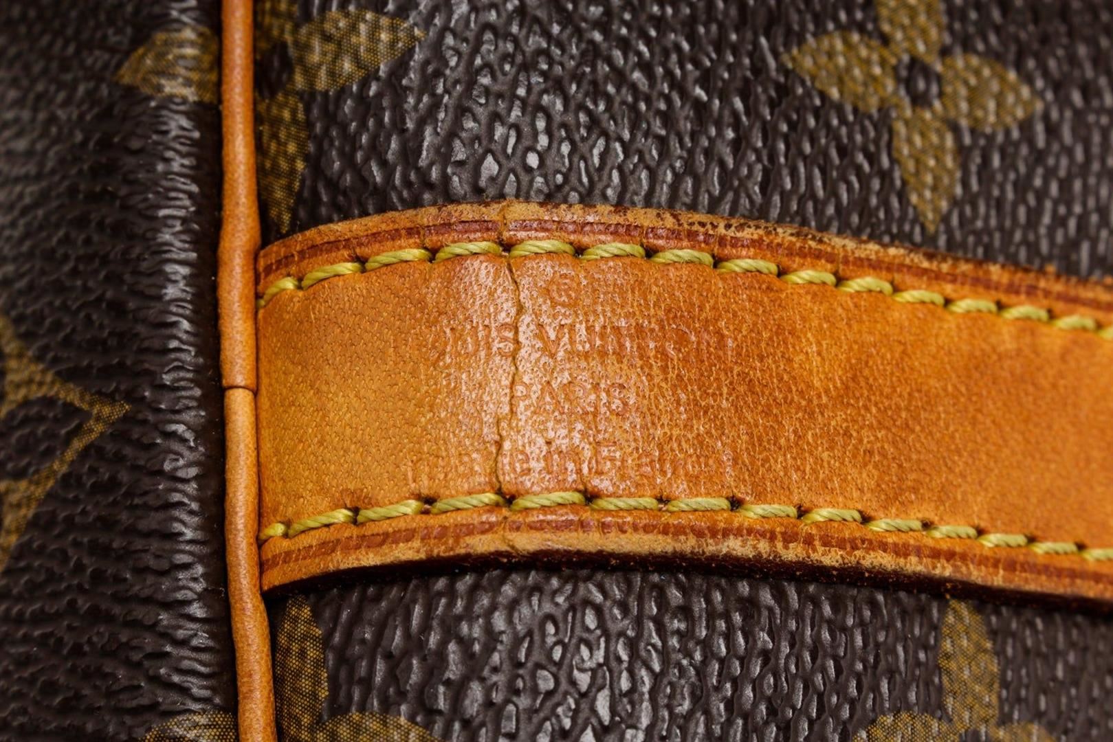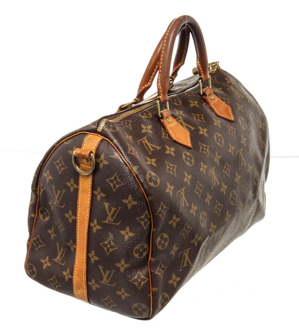 Louis Vuitton Brown Monogram Canvas Speedy 35cm Satchel Bag with monogram canvas gold-tone hardware, trim tan vachetta leather, interior slip pocket, dual top handle and zipper closure.