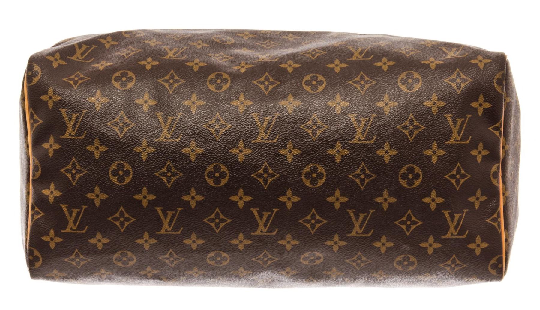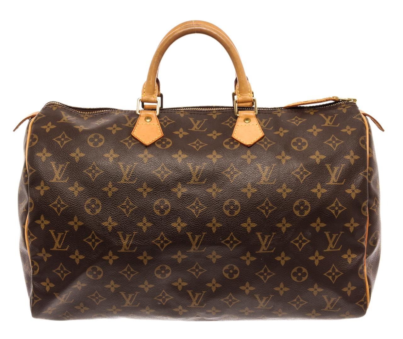 Louis Vuitton Brown Monogram Canvas Speedy 40 Satchel Bag. All available information is listed in the description and shown in the photos. Louis Vuitton Brown Monogram Canvas Speedy 40 Satchel Bag with brass hardware, leather trim, dual rolled leather top handles & dual shoulder straps, leather trim embellishment, canvas lining & single interior pocket, zip closure at top. Height: 14" Width: 15" Depth: 8", Handle Drop: 4" / 35.56 x 38.1 x 20.32 Cm