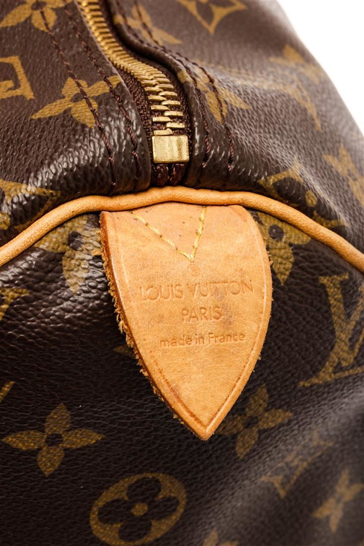 Louis Vuitton Brown Monogram Canvas Speedy 40 Satchel Bag. All available information is listed in the description and shown in the photos. Louis Vuitton Brown Monogram Canvas Speedy 40 Satchel Bag with brass hardware, leather trim, dual rolled leather top handles & dual shoulder straps, leather trim embellishment, canvas lining & single interior pocket, zip closure at top. Height: 14" Width: 15" Depth: 8", Handle Drop: 4" / 35.56 x 38.1 x 20.32 Cm